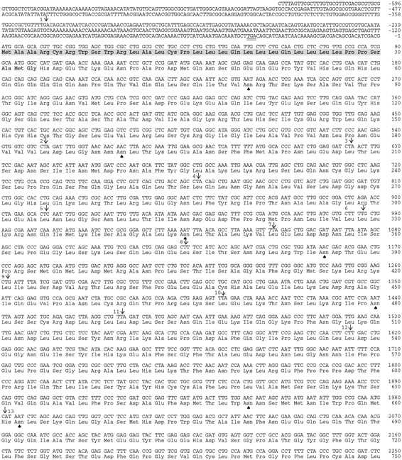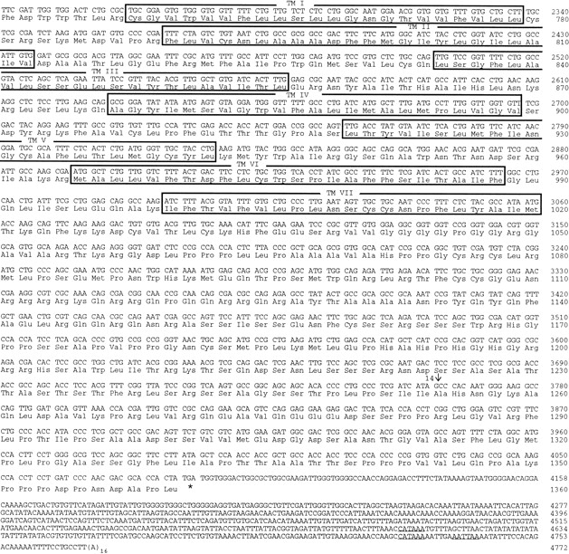 cDNA and deduced amino acid sequence of DLGR-2. This figure is compiled from the sequences of the overlapping cDNA clones 5′C-2, 5B, and 3′4-J (Fig. 1A). Nucleotides are numbered from 5′ to 3′ end, and the amino acid residues are numbered starting with the first ATG in the open reading frame. Introns are indicated by arrows and numbered 1–14. The seven membrane-spanning domains are boxed and labeled TM I—VII. The proposed signal sequence is shaded. Spades indicate potential amino-glycosylation sites. The inframe stop codon in the 5′ region, upstream of the assigned start codon is underlined twice; the translation termination codon is indicated by an asterisk (*). Putative polyadenylylation sites at the 3′ end are underlined.