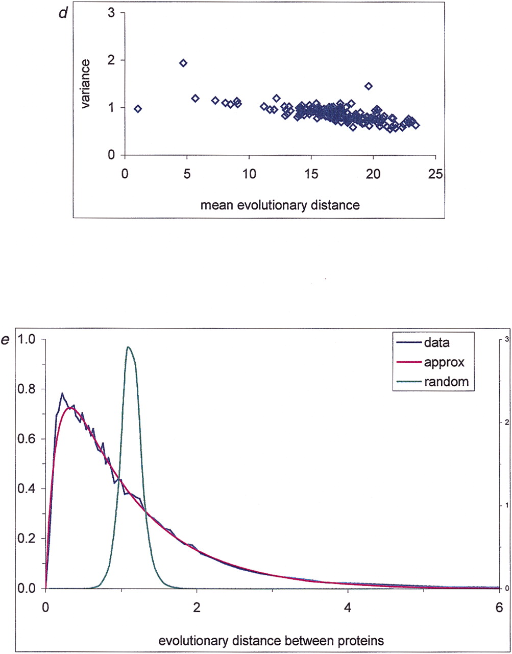 Interprotein rate variation. An empirical distribution function is shown for the fraction of unchanged sites (a), evolutionary distances (b), and normalized evolutionary distances (c) between likely orthologs for several genome pairs. For genome designations, see Methods. (d) Correlation between the variance of the distribution of normalized evolutionary distances and the mean distance between proteins in genome pairs. (e) Probability density function of interprotein substitution rate. The empirical density function of interprotein substitution rate estimated from distances obtained from genome comparisons (data), from approximation (approx) using formula (3), and from random sampling of the intraprotein rate distribution (random) are shown.
