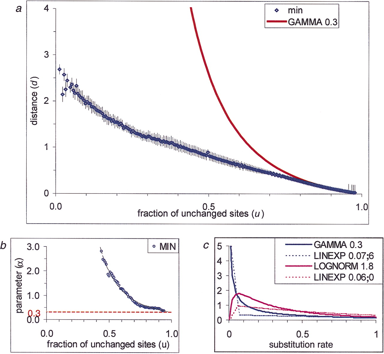 “GAMMA 0.3” shows the d(u) dependency when the gamma distribution with α = 0.3 was used to describe intraprotein rate variation. (b) Estimation of the α parameter of the gamma distribution. The α values were extrapolated to u = 1. The obtained upper estimate for the α parameter is indicated by the red dotted line. (c) Probability density functions used to describe intraprotein rate variation. The figure illustrates two possible shapes of