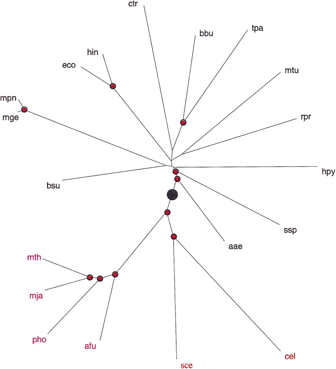 A phylogenetic tree for complete genomes. The nodes supported by bootstrap values >70% are marked by red dots. The inferred root position is indicated by a black circle. For genome designations, see Methods.