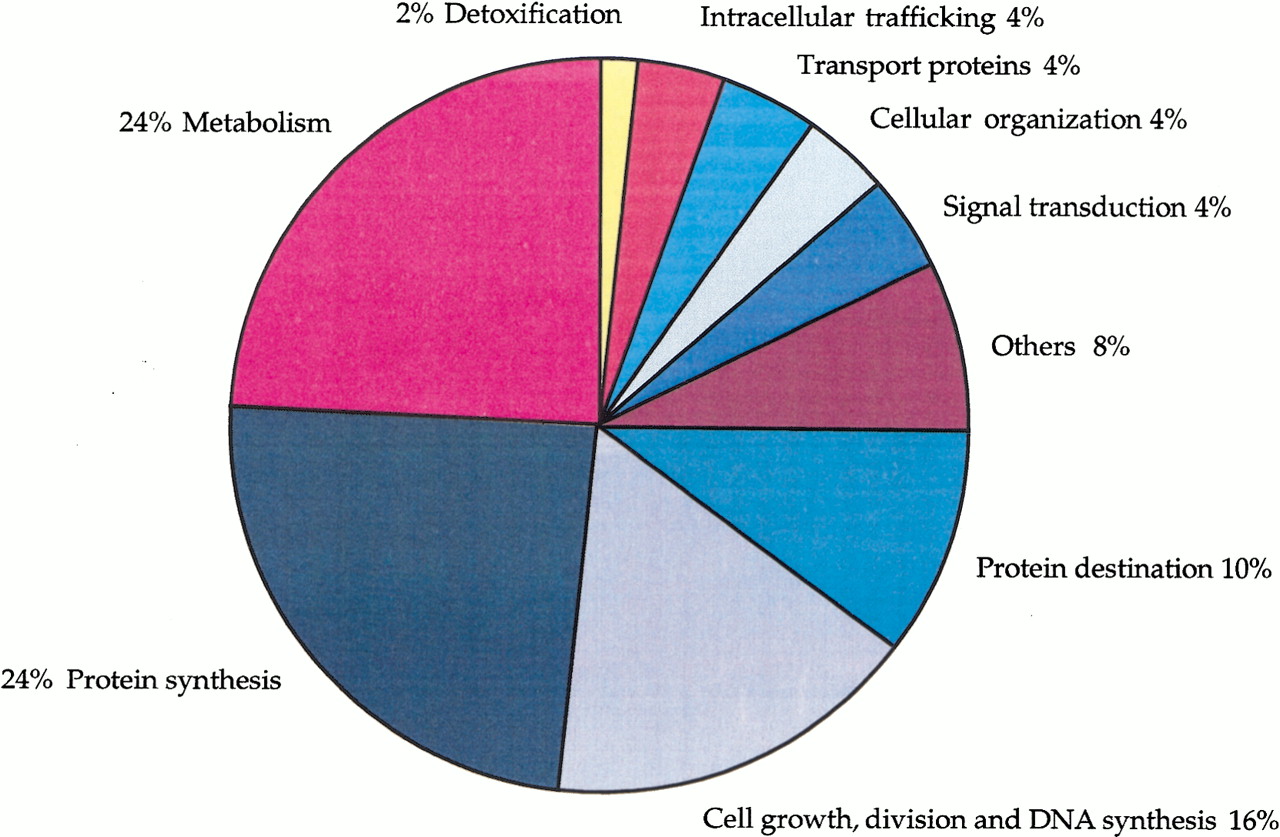 Functional classification of Trypanosoma cruzi ESTs. The transcripts with putative identities to proteins other than highly abundant gene families in T. cruzi were divided into functional categories. The largest groups were genes involved in protein synthesis and metabolism. The group designated protein destination included genes for protein modification, folding, and proteolysis and the group named others mainly contained genes with protein kinase, DNA-binding, and Zn-finger motifs (www.genpat.uu.se/tryp/tryp.html).