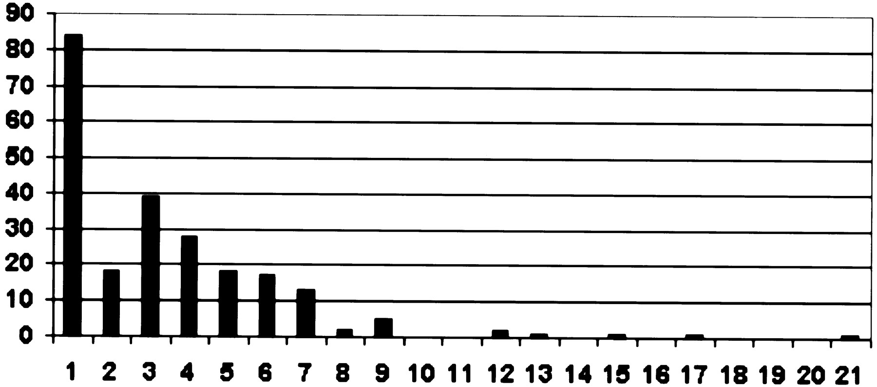 Synteny summary graph. The horizontal axis is how many pieces a C. briggsae clone needed to be broken into for maximal alignment with the C. elegans genome. The vertical axis is the number of clones broken into that many pieces. There were 229 clones, and the average clone size was 34,722 bases. Clones were broken up if the best aligning region of one 2000-base region of the C. briggsaeclone aligned to a spot 50,000 bases or more away or on a different chromosome from where the previous 2000-base region of the C. briggsae clone aligned best. The 2000 base regions overlapped by 1000 bases. The average length of a broken-up region was 8553 bases. The bimodal distribution suggests that ∼40% of the genome is resistant to rearrangements and the rest is not.