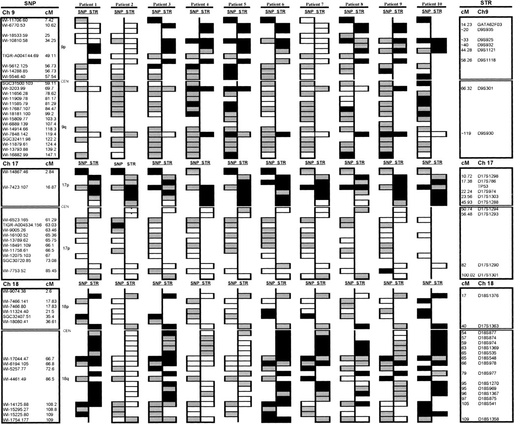 Comparison of the SNP array-based and microsatellite STR-based analyses for chromosomes 9, 17, and 18. For each normal and aneuploid pair, the SNP results are shown on the left and the STR results on theright. For the SNP data, allelic imbalance was called if theP̂ value for the normal sample was within the range 25 ≤ P̂ ≤ 75, the P̂ value for the aneuploid samples was P̂ ≤ 25 orP̂ ≥ 75, and if ‖ ΔP̂ ‖ > 20 between normal and aneuploid samples. For the STR data, allelic imbalance was determined by use of the formula [aneuploid allele height A/B]/[normal allele height A/B] and was called if the ratio was <0.4 or >2.5, depending on which allele was lost. (Open rectangles) Retention of heterozygosity; (closed rectangles) allelic imbalance; (hatched rectangles) non-informative loci. The two techniques were said to be in agreement if adjacent loci from both approaches showed either allelic imbalance or if both were heterozygous (excluding regions that were non-informative). (*) STR markers with allele ratios that were only slightly below the threshold for scoring LOH. These may represent instances of polysomy.