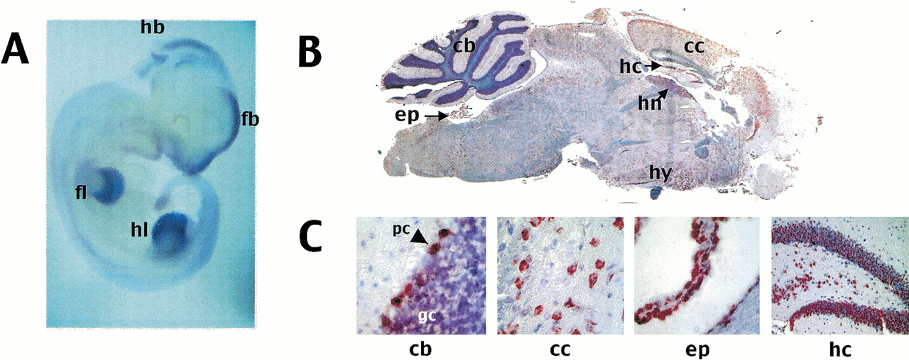 Localization of Usp29 transcripts in mouse embryo and adult brain. (A) Whole mount in situ hybridization of Usp29 to 10.5-dpc embryo. Usp29 expression (stained in dark blue) was detected at high levels in the face, forebrain (fb), hindbrain (hb), forelimb (fl), and hindlimb (hl). (B) Sagittal section of whole adult mouse brain hybridized with Usp29 probe.Cells expressing the Usp29transcript are stained in red; the tissue has been counterstained with hematoxylin, which stains nuclei and therefore regions that are dense in neuronal cell bodies blue. Regions expressing Usp29at significant levels include cerebellum (cb), hippocampus (hc), habenula (hn), hypothalamus (hy), ependyma (ep), and cerebral cortex (cc). High-power magnification of selected Usp29-expressing regions, showing cell types expressing the gene. Left panel (cb): Section of the cerebellum, showing high levels ofUsp29 expression in Purkinje cells (pc) but not in the densely packed granule cells (gc); Center left panel (cc): section of the cerebral cortex, showing high levels of expression in pyramidal cells throughout the cerebral cortex; Center right panel (ep):expression in ependymal cells; and Right panel (hc): showing high levels of Usp29 expression in the granule layer of the hippocampus.