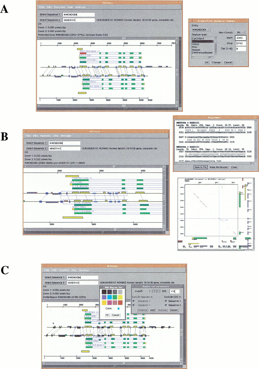 Alfresco user interface. (A) The display area shows a representation of two EMBL sequence entries of the orthologous mouse and human keratin 18 genes (mouse: ID MMENDOBA, AC M22832; human: ID HSKER101, AC M24842). Conserved regions are connected by gray lines. Dark yellow boxes represent conserved regions found by BLASTN/MSPcrunch, boxes in different shades of blue represent conserved regions found by DBA (see text). Gene structures are represented by blue borders and a name tag, with “>” and “<” indicating the direction of transcription. Coding and noncoding exons are indicated in green and yellow, respectively. The shown gene structures are the result of analyses with Blastwise, blEst_genome, and Genscan, respectively. Sequence repeats found by RepeatMasker are indicated by boxes in blue (LINEs), green (SINEs), brown (low complexity), and pink (simple repeats). CpG islands predicted by Cpg are shown as yellow boxes around the start of the first introns. The attributes of selected features (colored red) can be manually edited through a dialog window (seen on the right). (B) Subregions of the sequences can be selected and subjected to further analysis. To the right of the main window are shown a window displaying alignments of conserved regions found by DBA and a Dotter window of the selected regions. Conserved blocks found by DBA can be added to the display as features of the entries. Positions of features defined in Alfresco is exported to Dotter and displayed along the sides of the dot plot. (C) Regions similar to any other region can be identified using the “Region set parameters” dialog. These regions are displayed as dark gray boxes. The Cutoff scrollbar selects the threshold of similarity. Clicking on a region (the red box in the figure) will indicate which other regions belong to the same set by displaying blue boxes above the sequence representations. A selected Region set can be permanently added to the display with a choice of colors.