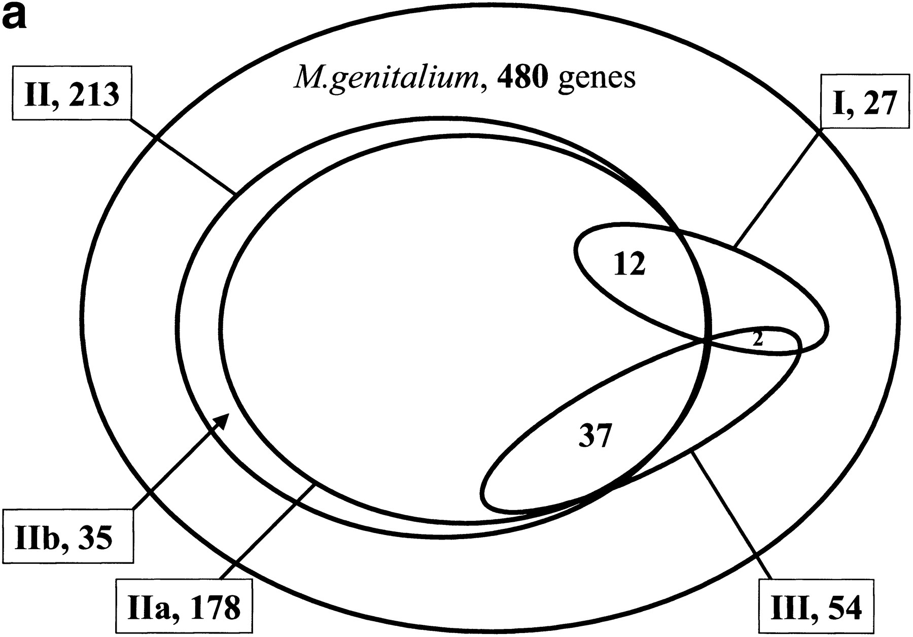 (a) Coverage of and overlap between various types of genomic context for M. genitalium genes. Type I is gene-fusion. Type II is the conservation local gene neighborhood, which is separated in type IIa (the conservation of gene order) and type IIb (the co-occurrence of genes within potential operons in absence of the conservation of gene order). Type III is the co-occurrence of genes in genomes. (b) Overlap between genes for which significant genomic context is available and genes for which functional features can be predicted by homology searches. For the latter, only genes that are homologous to genes with known molecular functions were included, which were determined by manual inspection. The dark gray areas in the figure are genes for which new functional features can be predicted by genomic context. They can be homologous to proteins with a known molecular function, in which case the context can indicate in which process this function plays a role (see text for specific examples). A complete list of genes for which new functional features could be predicted by genomic context and, if available, homology to proteins with known function, is available from http://dove.embl-heidelberg.de/MG/Context.