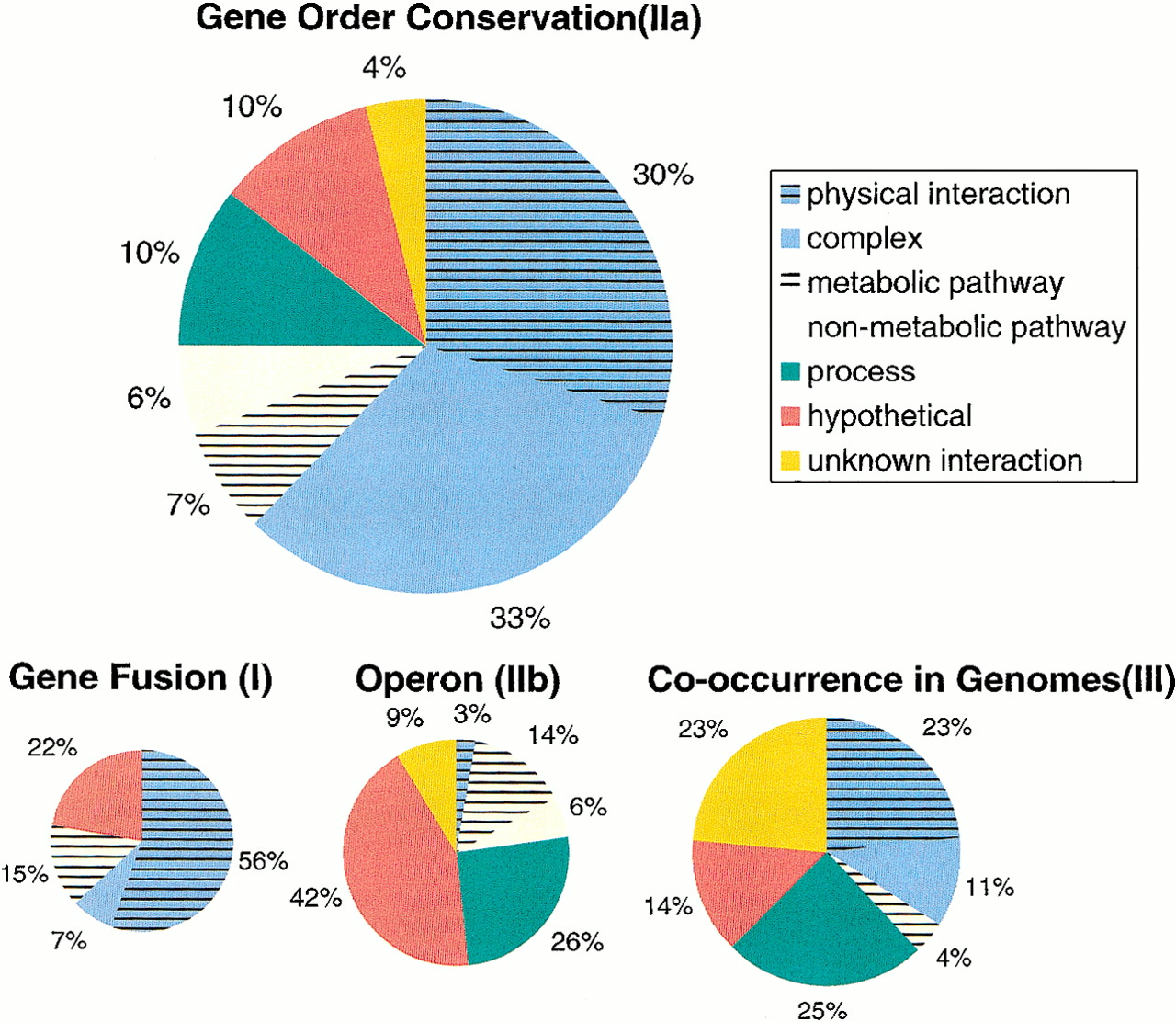 Class 5 was only considered if the functional interactions between the proteins did not fall in classes 1–4. Types of functional interactions can be counted in two ways: per gene and per interaction. In general, the number of interactions is smaller than the number of genes, as two interacting genes only represent a single interaction. However, a single gene can have multiple genomic associations: In those cases they were normalized per gene. The results in the figure are based on a per gene count. The frequencies of the different classes of functional interactions did not alter significantly upon counting each interaction.