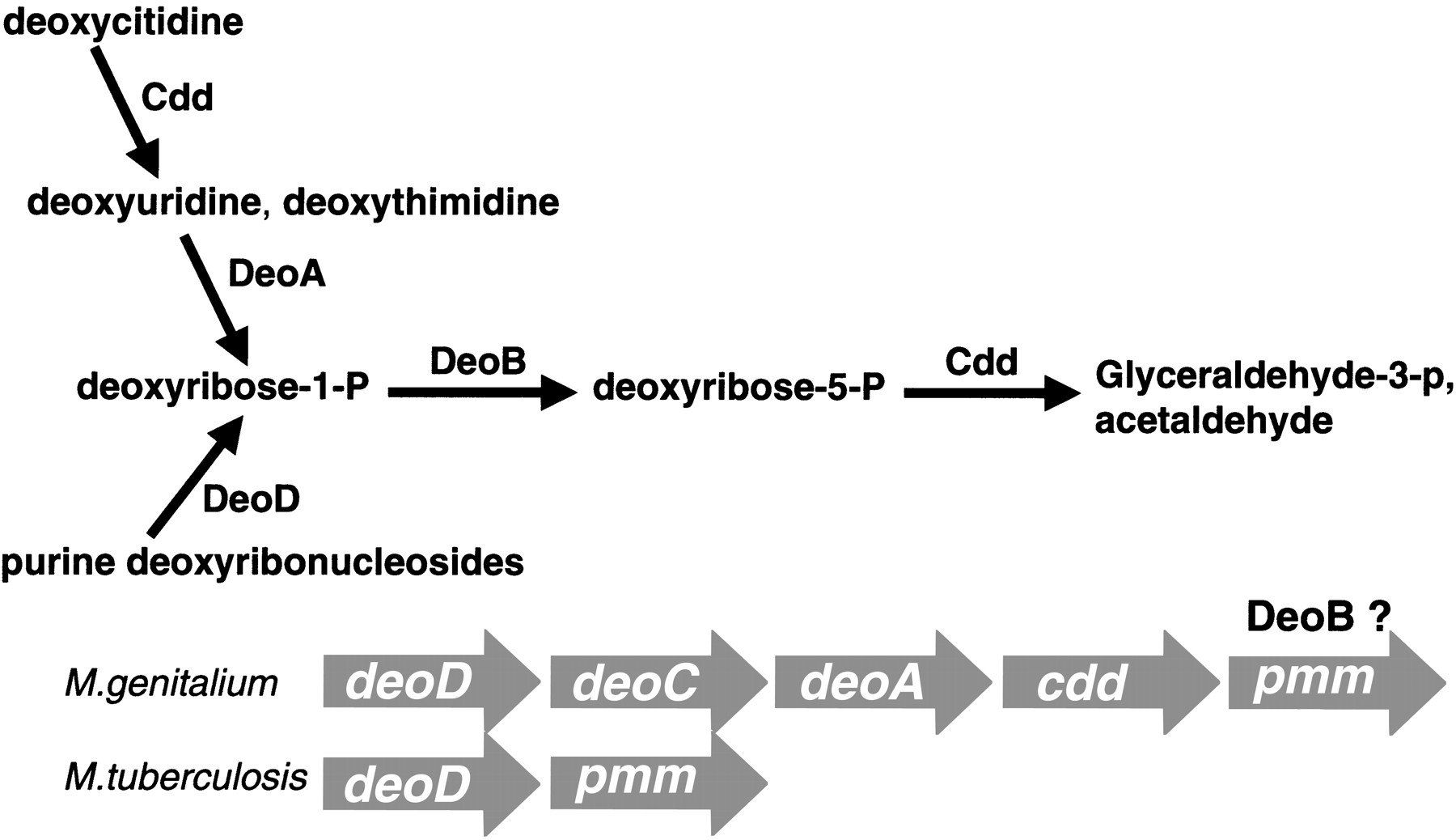 Genomic context predicts substrate specificity of proteins involved in a nucleoside salvage pathway in M. genitalium. A cluster of five genes in M. genitalium encodes four genes of a nucleoside salvage pathway. The “standard” gene for this fifth reaction in the pathway, phosphoribomutase (deoB), is absent. The fifth gene in the operon is homologous to phosphomannomutases and phosphoglucomutases. M. genitalium does not contain any other candidate for a phosphoribomutase. The most likely candidate for the phosphoribomutase is thus MG053. The significance of the location of a homolog of MG053 in a run with deoD is supported by the location of a homolog of the M. genitalium gene MG053 besidedeoD in Mycobacterium tuberculosis.