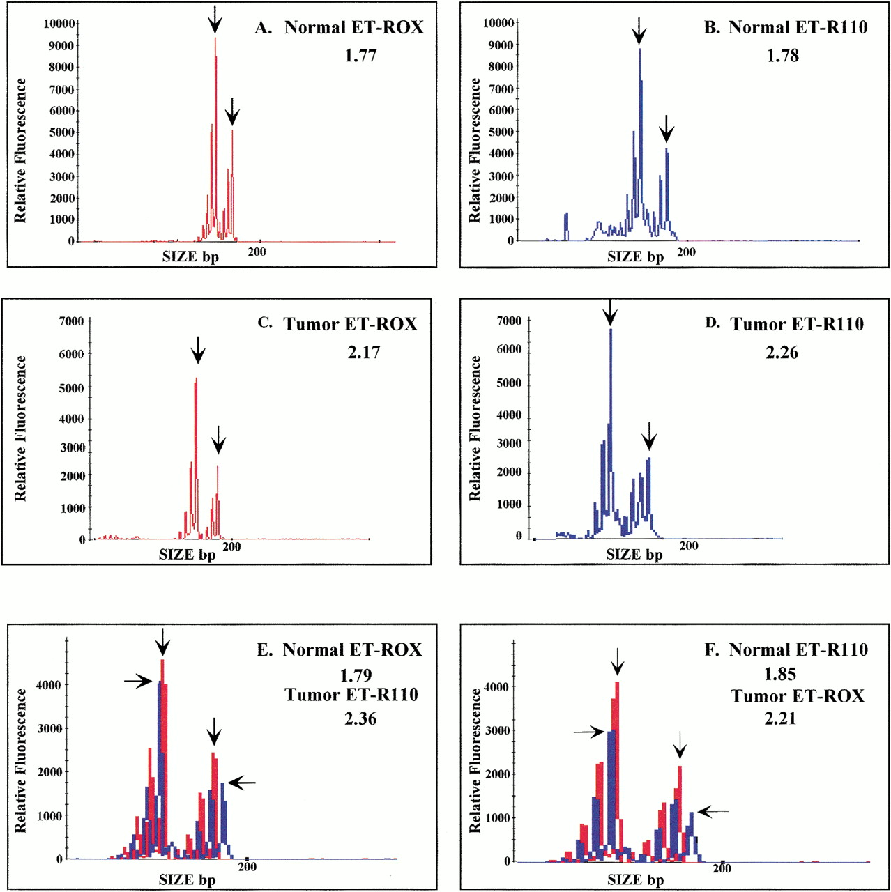 Two-color LOH assays using complex samples (sample set 10). (A,B) Electropherograms from a normal sample amplified at the D9S171 locus with both ET-ROX (red) and ET-R110 (blue) primers. (C,D) Electropherograms from the matching tumor samples with both primer sets. (E,F) The resulting electropherograms from co-injected two-color samples. The numbers given at the right of each panel are the allelic ratios. The arrows indicate the peaks used for allele ratio determination.