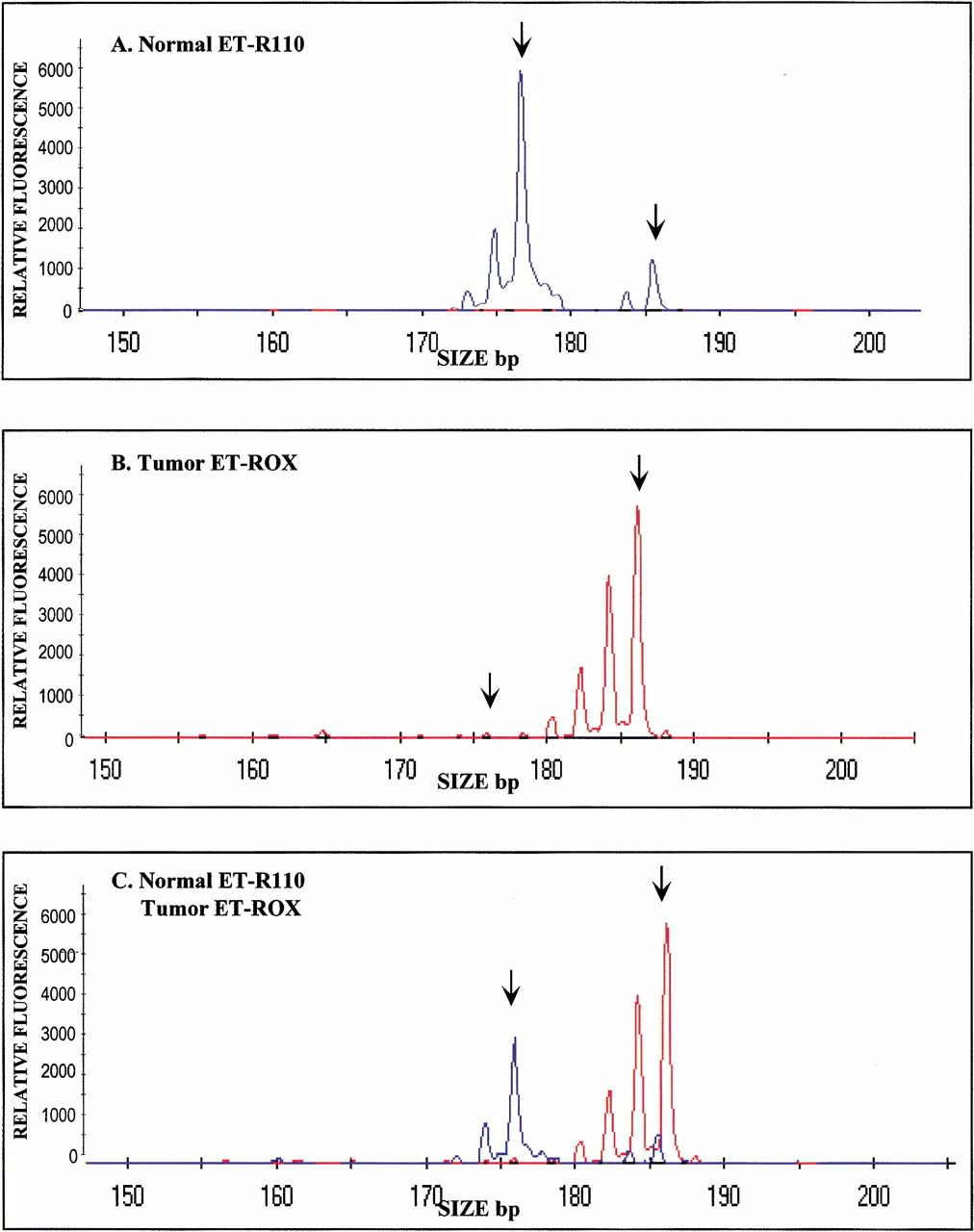 Two-color electropherograms of D9S171 loci amplicons showing complete loss of heterozygosity (sample set 22). (A,B) Normal sample amplified with the ET-R110 (blue) labeled primer and the tumor sample amplified with the ET-ROX (red) labeled primer, respectively. (C) Co-injected mixed sample. The arrows indicate the two alleles being compared. The slight difference in intensity is caused by dilution of one sample into another.