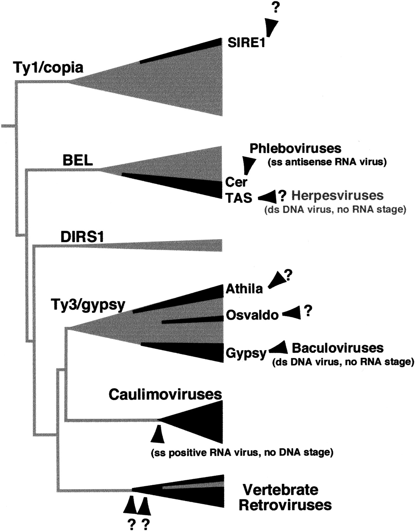 Schematic of env-like gene acquisitions in the evolutionary history of LTR-retrotransposons. The LTR retrotransposable elements are divided into six clades, each represented by a triangle. The height and width of the triangles represent the age (presumed without accounting for horizontal transfers) and current known diversity of each clade, respectively. Thus, although the DIRS1 clade has representatives in slime mold, fungi, and nematodes, indicating an ancient history, it is not as abundant as the other clades. Eight possible instances of anenv-like gene acquisition can be found and are indicated by the black regions. In four of these cases, the evolutionary origins of this env gene have been traced back to the viral source indicated. The strongest evidence was found in the Gypsy and Cer cases. The origins of the other four env-like genes remain unknown. In the case of the vertebrate retroviruses and the plant caulimoviruses, most members have an env gene, which has subsequently been lost in some endogenous vertebrate retroviruses. The exact number of env gene acquisitions in vertebrate retroviruses is unclear.