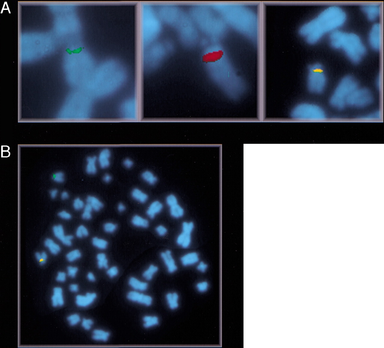 Variant-specific oligonucleotide probes distinguish homologous chromosomes by FISH. (A) Three classes of chromosome 15 are identified by the oligoprobes: those positive for 15VAR1.4 only (green; left panel), those positive for 15VAR2.4 only (red; center panel), and those positive for both 15VAR1.4 and 15VAR2.4 (yellow; right panel). (B) 15VAR1.4 (signal in green) hybridizes to both chromosomes from this individual (father in pedigree from panel C), while 15VAR2.4 (signal in red) hybridizes only to one. (C) 15VAR1.4 and 15VAR2.4 were used to follow the transmission of a single chromosome from parents to offspring. Half-shaded symbols, 15VAR1.4/15VAR2.4 heterozygotes; shaded symbol, 15VAR2.4 homozygote.