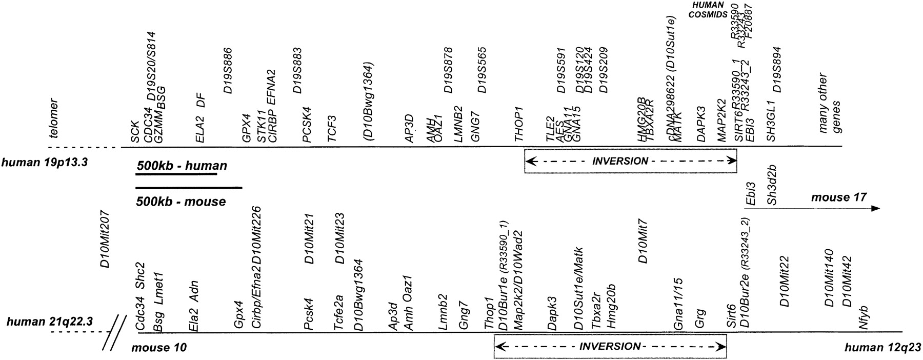Physical map of 19p13.3 and mouse chromosome 10 identifies inversion and synteny breaks. Overall physical map constructed from the cosmid contiguous sequence (contig) restriction maps (19p13.3) and schematic constructions of the mouse chromosome 10 pulsed-field gel electrophoresis (PFGE) map. The map shows overall conserved order and distances of many genes for ∼2500 kb — ∼1800 kb in mouse—followed by a region of ∼1200 kb — ∼900 kb in mouse — which is inverted in the two species relative to each other. In most cases, the mouse and the human gene names are identical or nearly identical (see also Table 1). The mouse genetic markers (D10Mit …) were placed onto the map using genetic breakpoints and yeast artificial chromosomes (YACs). The mouse map overall is shorter than the human map. To better compare the gene order of the two maps, they were scaled proportionately, such that the maps are easily compared, but note that the size bars are different in size.