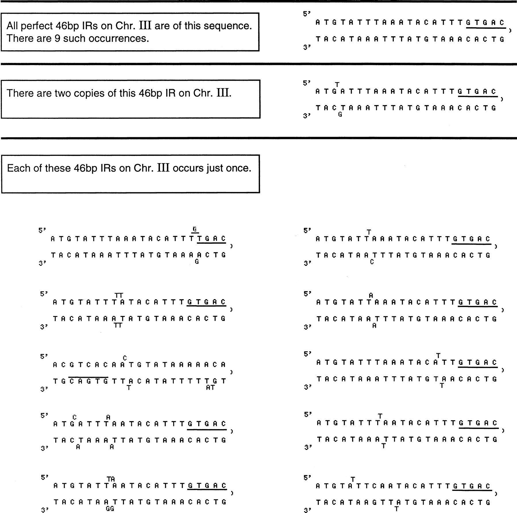 The structures of all twenty-one 46 bp perfect or imperfect inverted repeats that contain the GTGAC motif on Caenorhabditis eleganschromosome III. Note that the drawings of the repeats are for the purpose of visualizing the symmetries and are not meant to imply that these occur in vivo or in vitro or that they have been analyzed thermodynamically for base pairing potential.