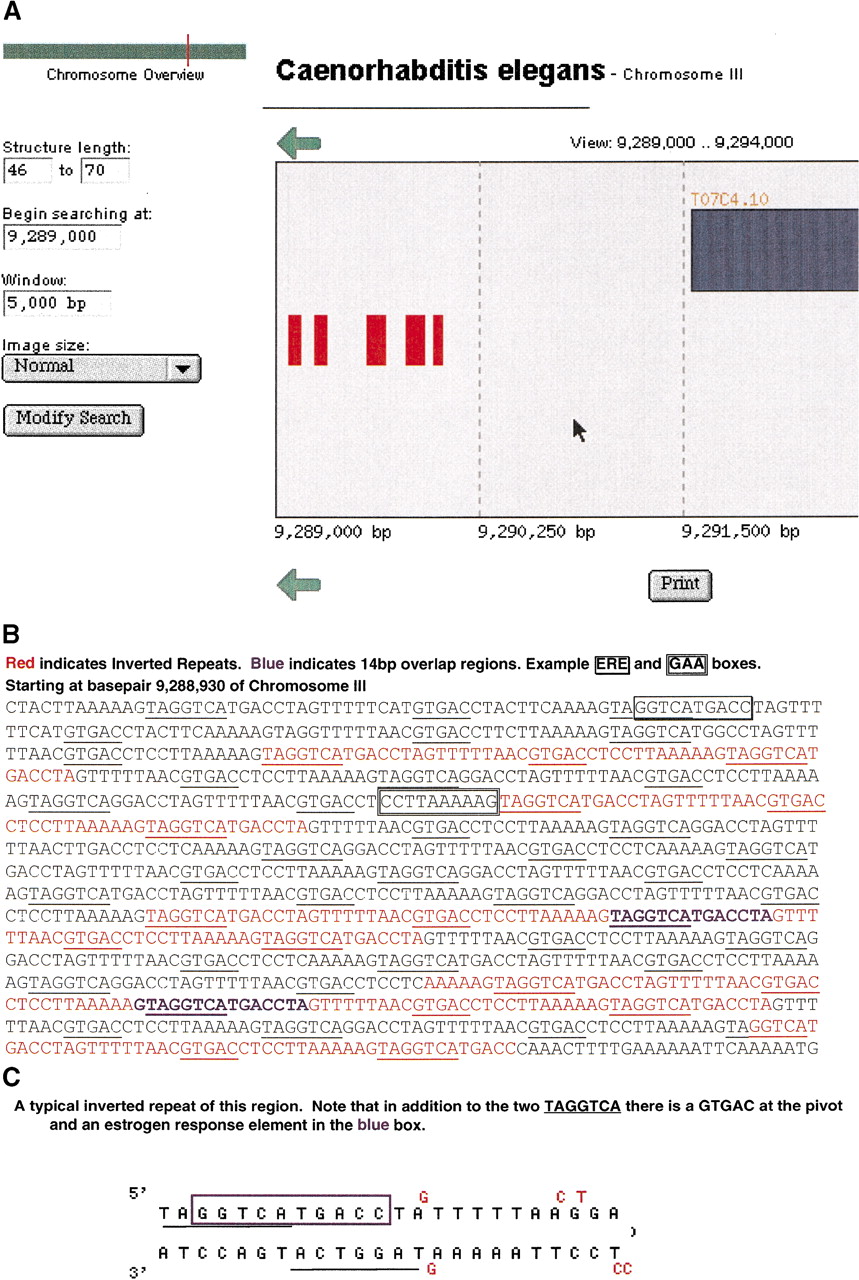 Inverted repeats in promoter region of a gene for heat shock protein hsp104. Note that this locus is rich with many additional inverted repeats of the type highlighted except that they fall below the limits of resolution of the search that stipulated no more than 10% mismatches on the stem. Motifs in this region include numerous GAA boxes and estrogen response elements (ERE) both identified in other heat shock promoters as well as GTGAC and TAGGTCA motifs. Two examples of GAA and ERE are boxed in this figure. The locus resembles the satellite-like configuration reported in other heat shock promoters.