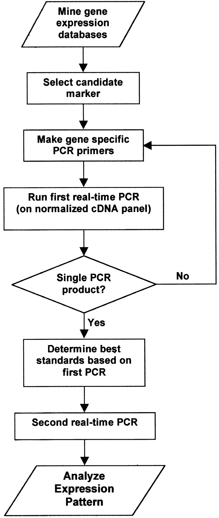 Process for finding candidate tumor markers, using fluorescent-PCR expression comparison (F-PEC). Genes overexpressed in tumors are mined from gene-expression databases. A normalized cDNA panel is used to rapidly compare expression levels in malignant and normal tissues. The process requires an initial PCR to determine the specificity of the primers, the product melting temperature, and the expression range of the tested samples. The highest-expressing sample from the first PCR is serially diluted to create a standard curve for a second PCR, yielding information on the relative expression over several orders of magnitude.