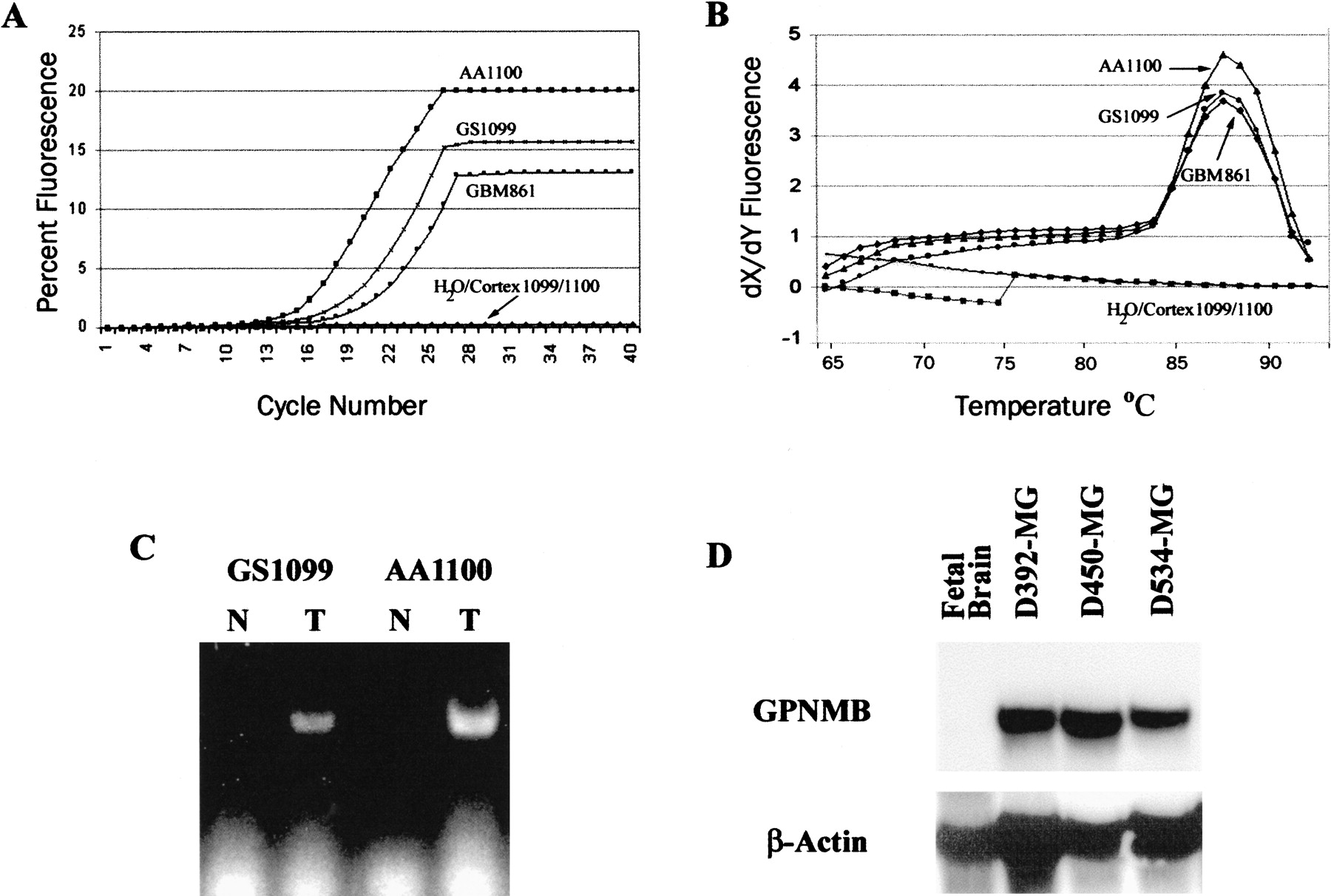 Fluorescent-PCR verification of a candidate glioblastoma marker, GPNMB. (A) Template cDNA from a bulk glioblastoma (GBM 861) and matched glioma/normal tissue pairs (GS1099/Cortex1099 and AA1100/Cortex1100) were amplified with primers specific for GPNMB. (B) Melting curve analysis is performed simultaneously to optimize detection temperature, revealing a single peak consistent with a single amplification product. (C) After fluorescent-PCR, all reaction products were visualized on an agarose gel to verify a single product of the correct size. (D) Northern blot of normal fetal brain and three established GBM cell lines also show a difference in expression forGPNMB.