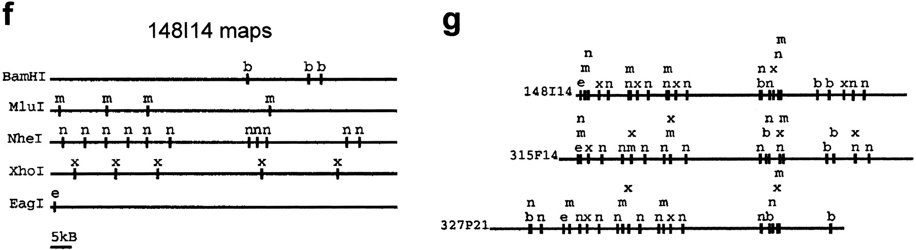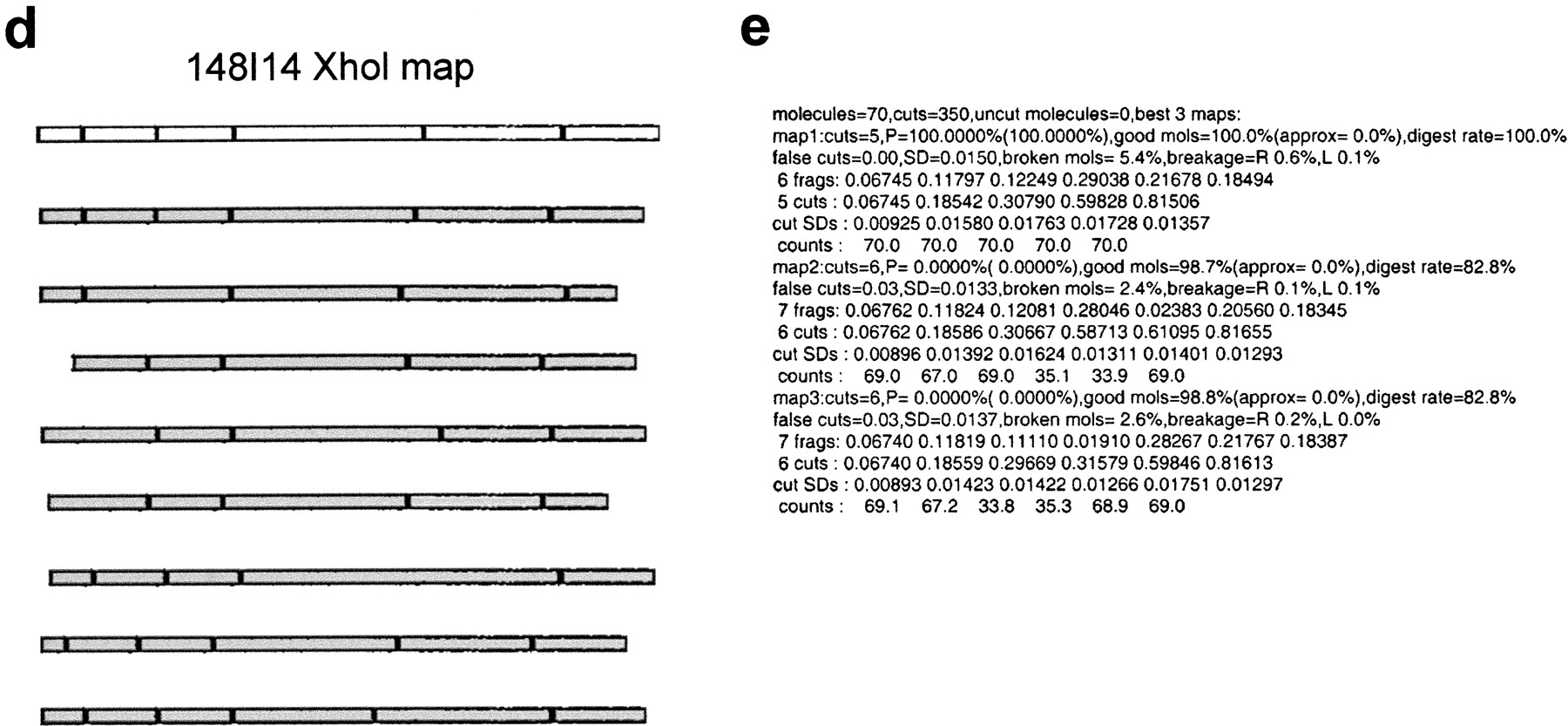 Overview of optical mapping system. (a) Optical mapping station for image collection, including a Zeiss 135M Axiovert microscope, SIT camera, and Sony monitor for viewing slides and CCD camera (attached underneath microscope), Ludl controller, and Dell and Sun computers for image collection. (b) Uncut BAC DNA deposited on optical mapping surface. (c) BAC DNA (clone 148I14) digested on optical mapping surface with restriction enzymeXhoI. (d) Illustration demonstrating construction of highest probability single-enzyme (XhoI) map (white background) from individual input molecules (gray background) of clone 148I14. (e) Output of automatic map-making program indicating the three most probable XhoI maps of clone 148I14. Statistics provided by the map-making program include the number of molecules used to construct the map, the probability (P) of each map, the percentage of molecules that fit the map (good mols), the fraction of cuts that are false cuts, and the percentage of molecules that show breakage at either the right or left ends (breakage R or L). (f) Single-enzyme maps of clone 148I14. In general, the map with the highest probability is chosen as the final map. (g) Composite map of clone 148I14 is constructed by overlaying the single-enzyme maps after the orientation of single-enzyme maps has been determined. GENTIG then attempts to create a contig of this clone with any other overlapping clones (315F14 and 327P21).