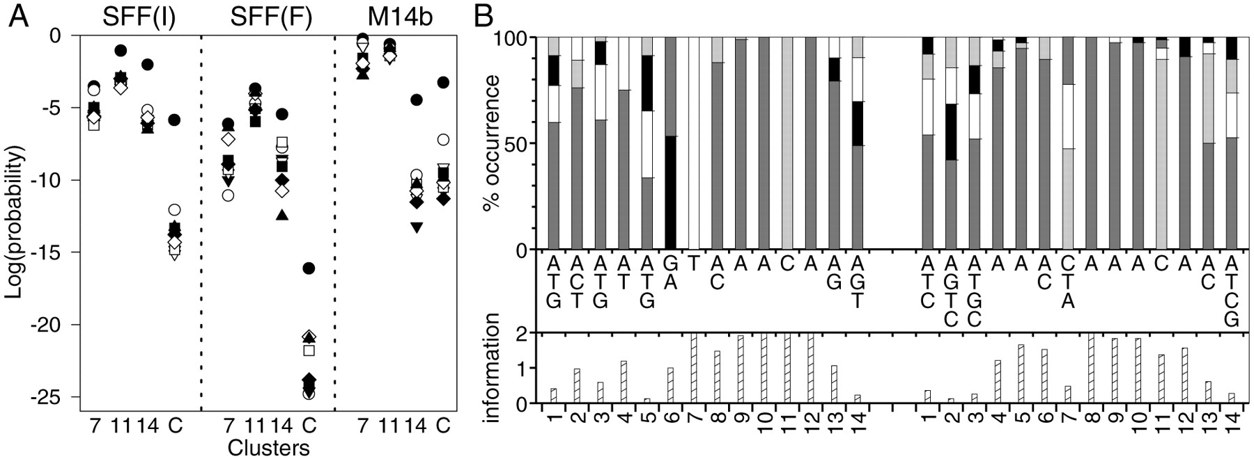 (A) Probability plot of observing at least the numbers of genes from a sample of genes with upstream regions that match the initial (SFF-I) and final (SFF-F) SFF-like motifs and the M14b motif in clusters 7, 11, and 14 and the combination of the three clusters. The sample size symbols are as in Fig. 1. (B) The SFF-F motif (left, from 92 sequences) and the M14b motif (right, from 76 sequences) in the format described in Fig.3. The M14b motif is taken from the same strand as the SFF-F motif.