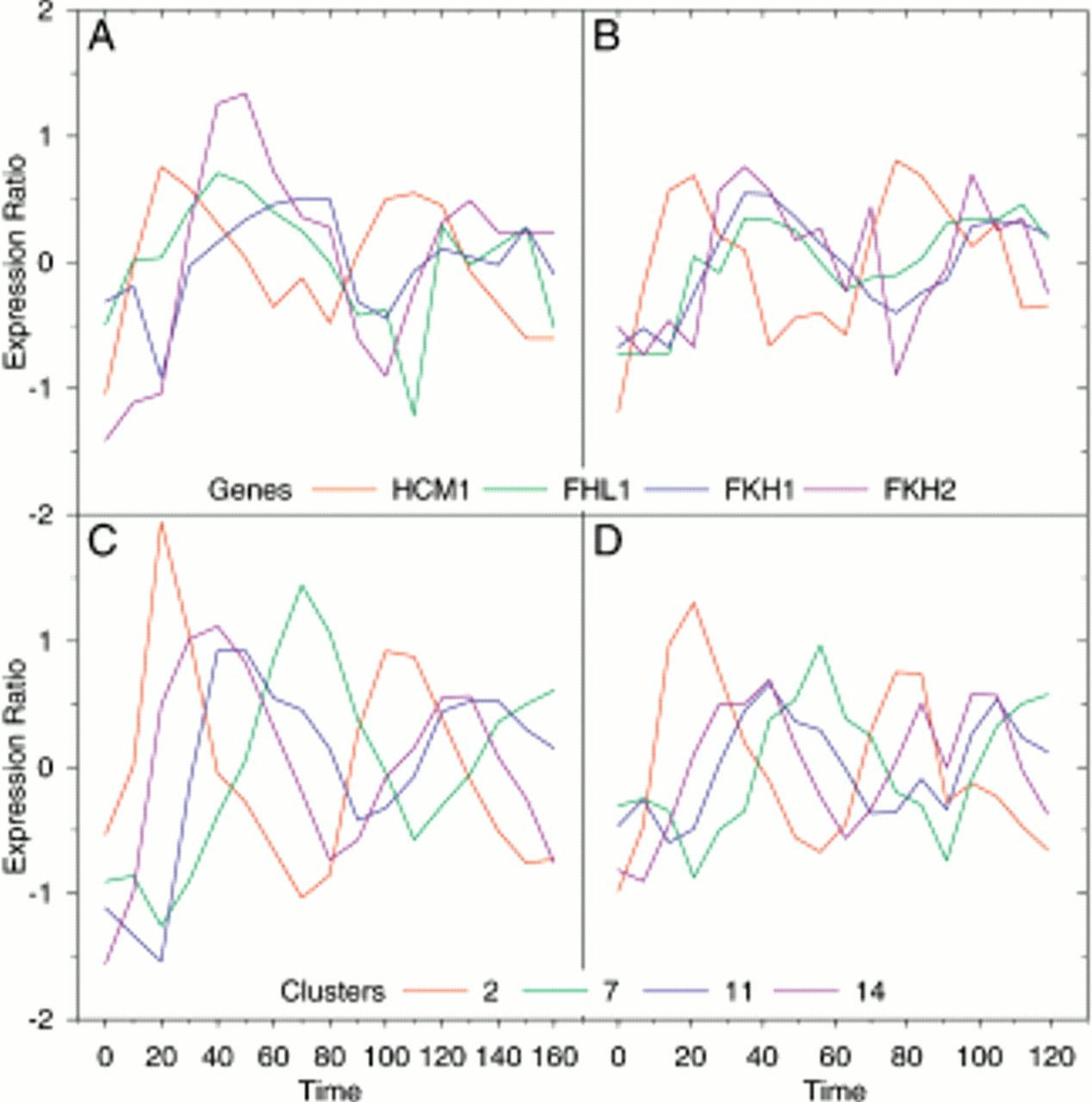 Expression profiles of the yeast forkhead genes, HCM1, FHL1, FKH1, and FKH2, in the cdc28 synchronized (A) and α-factor synchronized (B) experiments and the mean expression profiles of clusters 2, 7, 11, and 14 in the cdc28 (C) and α-factor (D) synchronized experiments. The data were taken from the website of Spellman et al. (1998).
