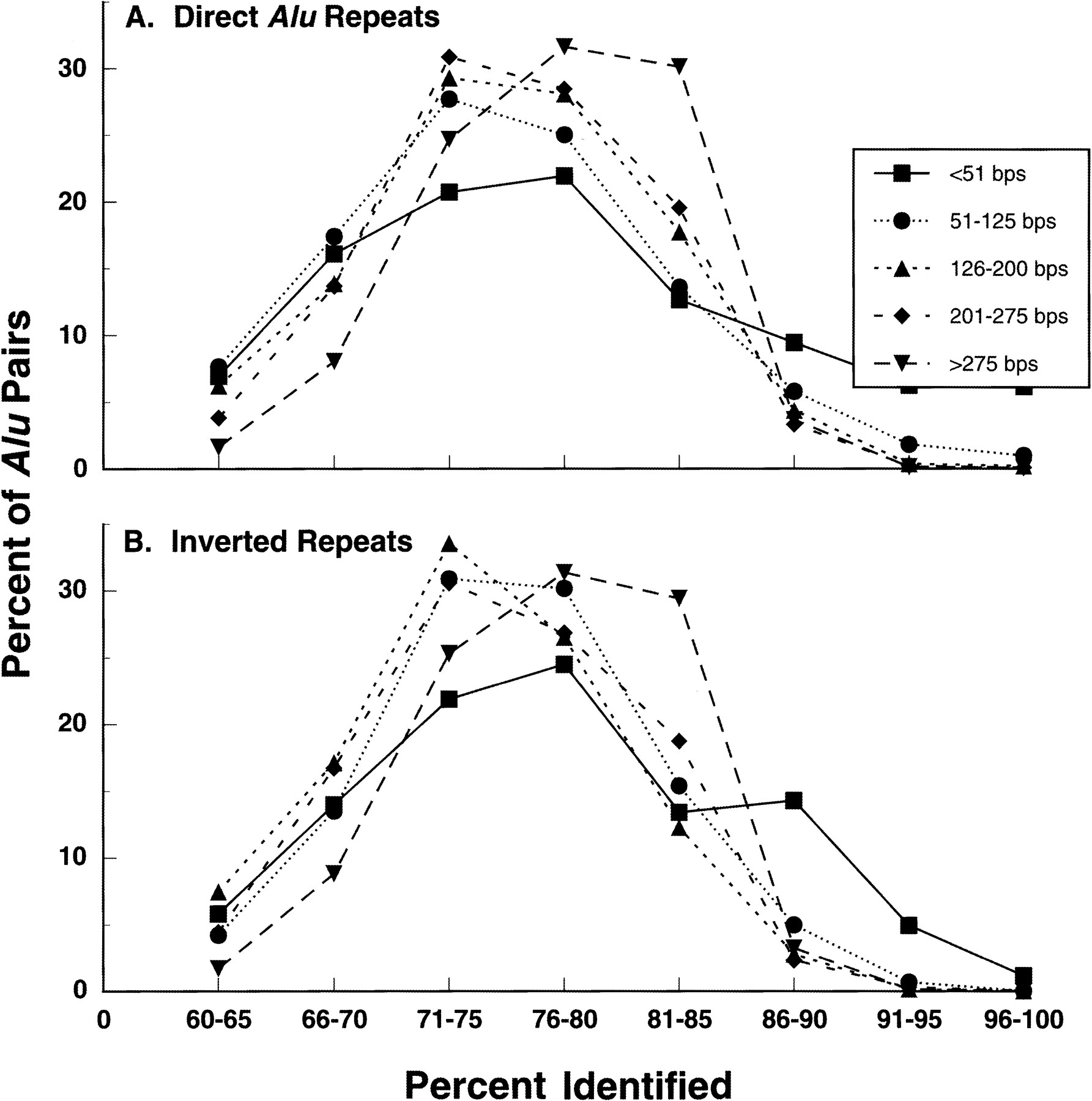 The frequency of Alu pairs with different levels of homology in their aligned regions. Presented is the distribution of direct (A) and inverted (B) Alu pairs sharing different lengths of alignment in relation to the extent of homology. The data are derived from all the Alu pairs shown in Figure 1.