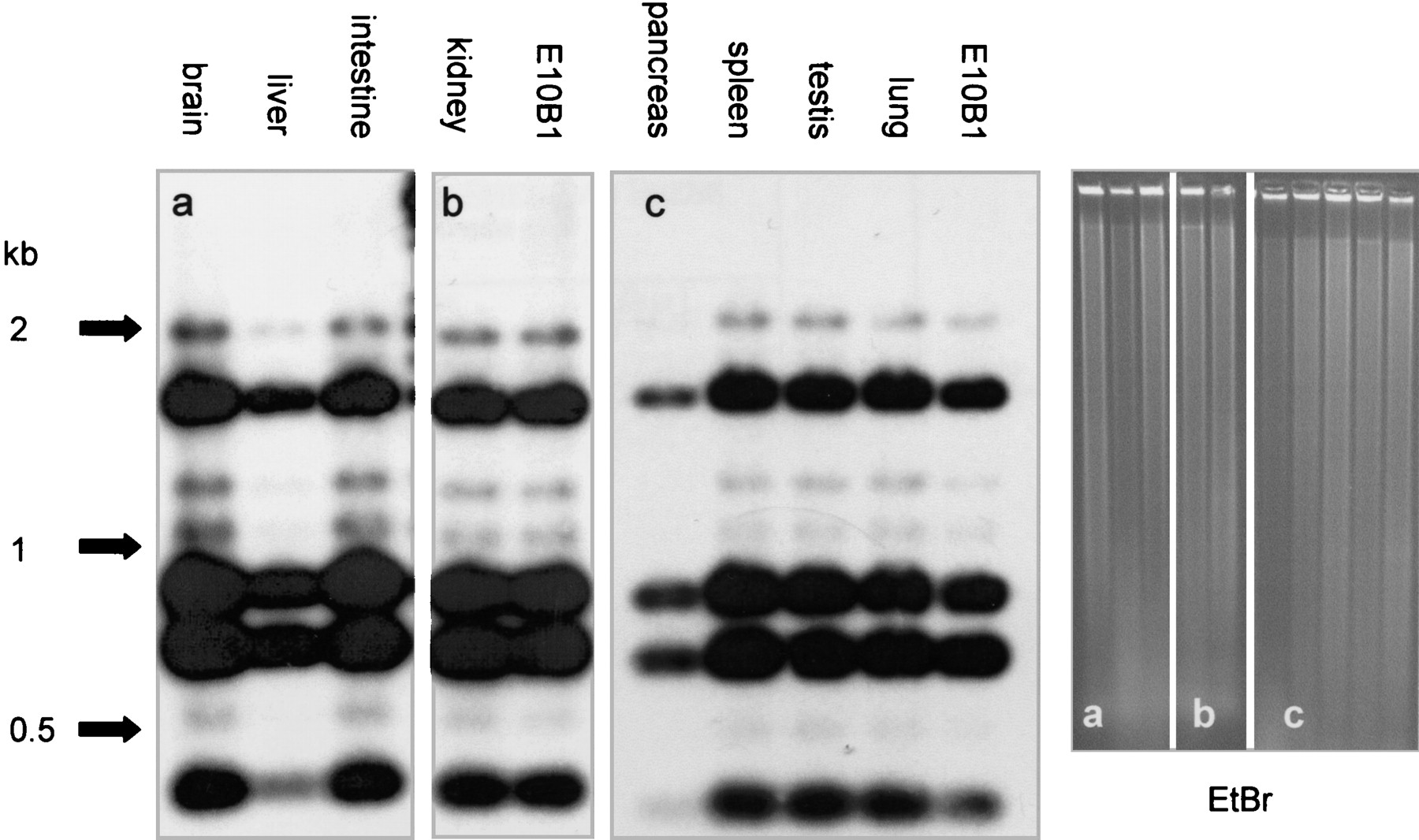 Tissue distribution of the HCV. Southern blot analysis of the HCV. DNA prepared from different tissues of an HCV+ F1 mouse was digested with XbaI, size-separated, and blotted. The left panel shows hybridization with a human alphoid-2 probe. The signal obtained for the different tissues is identical to the signal obtained for the E10B1 clone. The right panel shows the ethidium bromide–stained agarose gels.
