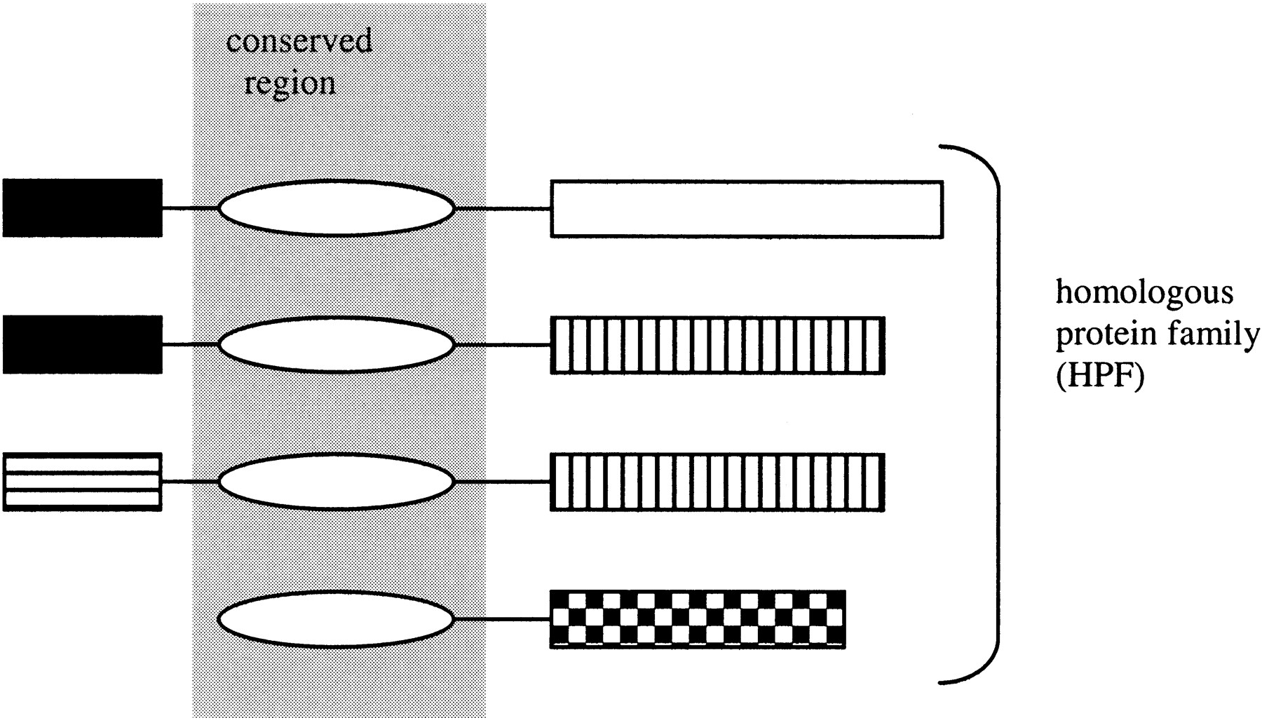 Schematic representation of a homologous protein family (HPF). Identically shaded boxes represent identified regions of each protein that have sequence homology. HPFs are constructed computationally by identifying one (or more) region(s) of sequence homology (i.e., unfilled oval) that builds the largest group of sequences. The HPF-conserved sequence region can be found in all proteins in the HPF.