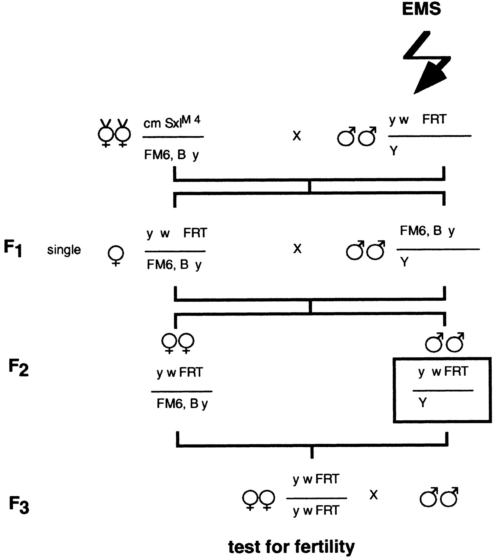 Crossing scheme used to isolate X chromosome female sterile lines. Males of the genotype yw118FRT19A (Bloomington stock B1744) were mutagenized, and F3 female progeny were tested for fertility.SxlM4 is a male lethal allele of Sxl and was used to eliminate unwanted males from the first cross.