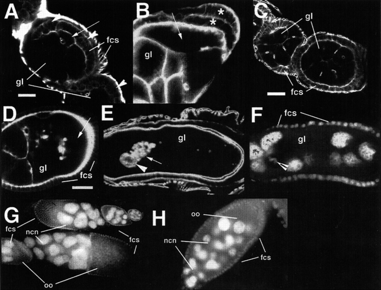 Genes required for mid-oogenesis. (A)fs(1)186/fs(1)186 mutant's egg chamber labeled for actin to show abnormal aggregation of follicle cells over the oocyte. The arrowheads point out some of the follicle cells that do not contact the germline. (B) Stage 9 egg chamber fromfs(1)186/fs(1)186 in which follicle cells have formed a two-layer epithelium over the oocyte (* indicates follicle cell layers). (C) The follicle cell aggregation phenotype is partially suppressed infs(1)186/fs(1)186;Bic-DPA66 /Df(2L)TW119. (D,E) Actin staining in a stage 5 (D) and a stage 9 (E) fs(1)234 /fs(1)234mutant egg chamber showing the progressive loss of germline cell membranes. (F) Same egg chamber as in (E) stained for nuclei. The strong actin staining in (E) is due to aggregation of ring canals (arrow in E) and the border cells (arrowhead inE and F). Scale bars in (A,C,D) = 20μm. Nuclear labeling of fs(1)225/fs(1)225 mutant ovaries reveals (G) enlarged nurse cell nuclei and (H) supernumerary nurse cells.