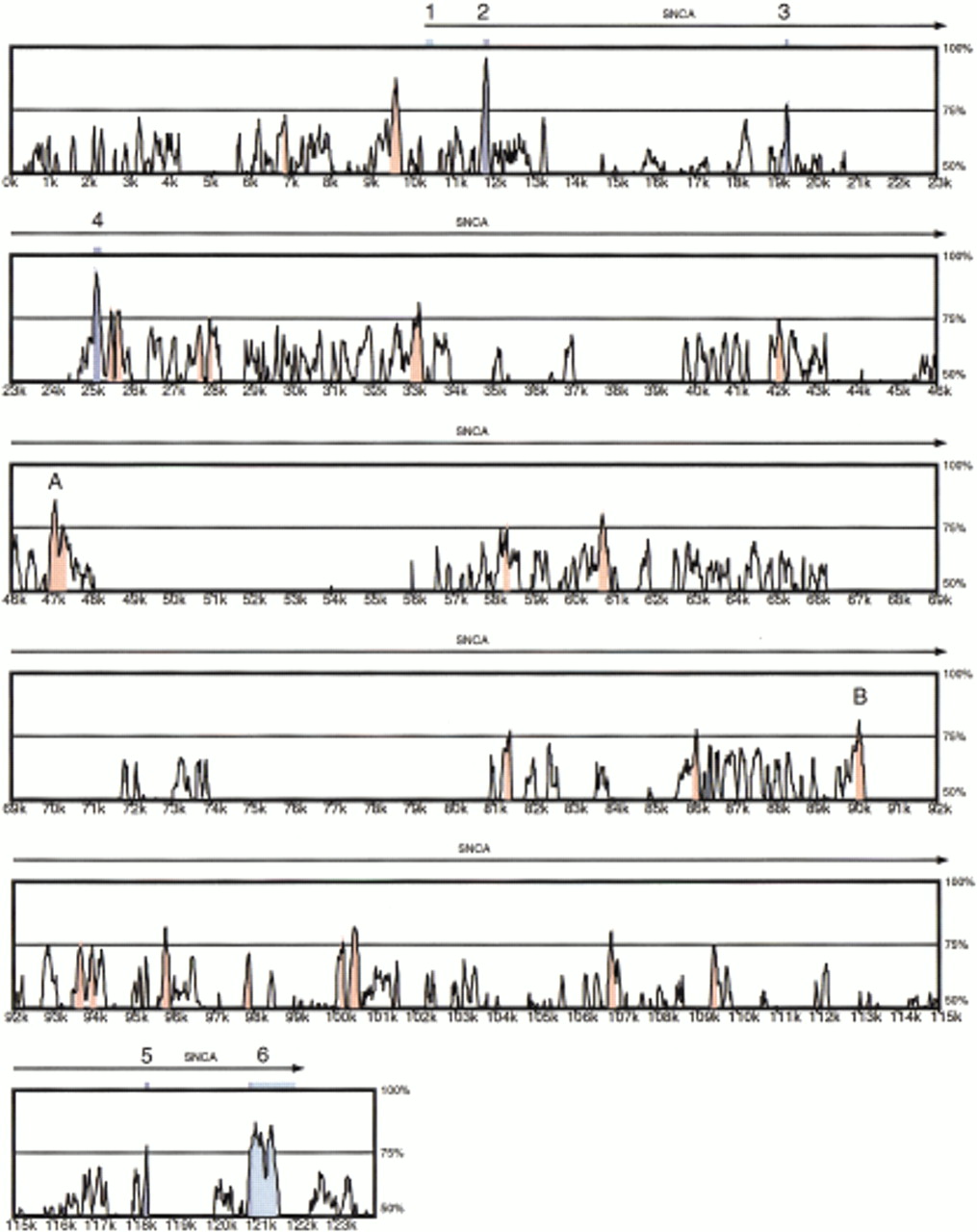 Global alignment of human SNCA and mouse Snca. Numbers on the vertical axis represent the proportion of identical nucleotides in a 100-bp window for a point on the plot. Numbers on the horizontal axis indicate the nucleotide position from the beginning of the human genomic sequence. Peaks shaded in blue correspond to theSNCA/Snca coding regions. Peaks shaded in light blue correspond to SNCA/Snca mRNA untranslated regions. Peaks shaded in red correspond to evolutionary-conserved regions (ECRs), defined as areas where the average identity is >75%.