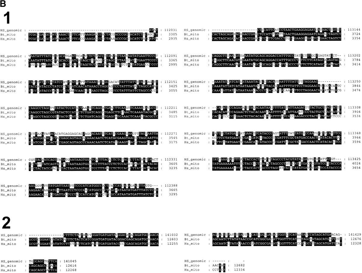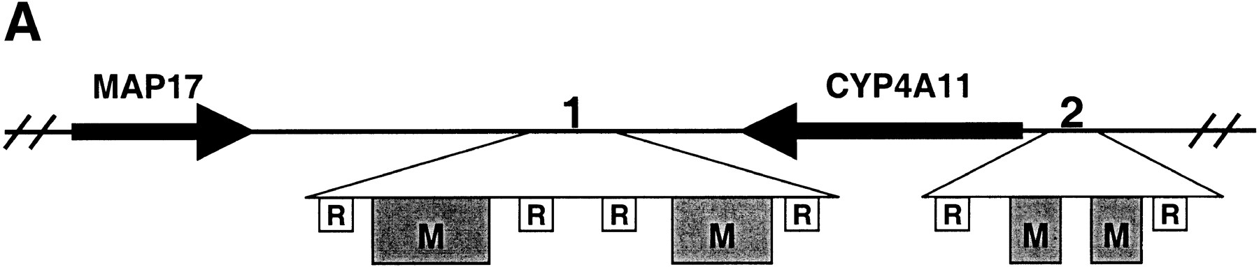 A transposition of mitochondrial DNA 3′ of the humanMAP17 gene. (A) Diagram showing the position of the two mitochondrial homology regions relative to the MAP17 andCYP4A11 genes. Boxes labeled M correspond to the mitochondrial homology regions shown in (B), and boxes labeled R show the position of repeat elements. (B) Alignment of mitochondrial homology regions 1 and 2 to mitochondrial sequence of cow and human.
