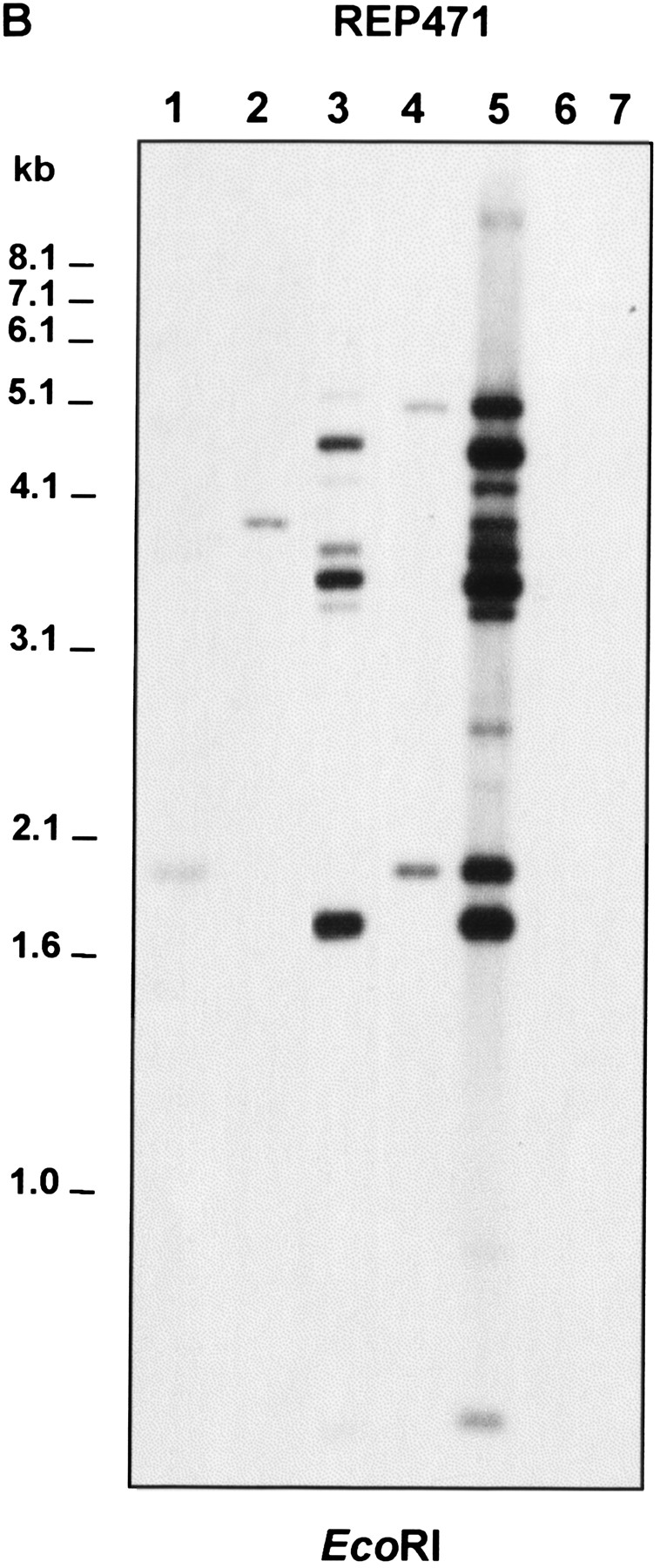 Detection of several copies of REP471 on chromosome 15 and other human chromosomes. (A) Southern blot analysis of REP471 against human DNA shows a complex pattern with at least 11 fragments. (B) Southern blot analysis of REP471 against DNA from somatic cell hybrids containing single human chromosomes in a rodent background. Only those human chromosome lanes with positive hybridization are shown. Lane 1: DNA from somatic cell hybrid containing human chromosome 2; lane 2: human chromosome 7; lane 3: human chromosome 15; lane 4: human chromosome Y; lane 5: human genomic DNA from line IMR91; lane 6: mouse genomic DNA from line 3T6; lane 7: Chinese hamster genomic DNA from line RJK88. (C) CLUSTAL W alignment of 18 REP471 sequences belonging to human chromosome 15 present in the HTGS database division. The 18 REP471 sequences were grouped in 10 groups according to the observed differences (clones 152f13, 156n7, and 624n5 have each two copies of REP471, designated as .1 and .2). The localization of the clones containing the REP471 sequences was based on the position of the respective markers on the G3 and Genebridge 4 ratiation hybrid maps. Bold type indicates nucleotides that are different from the original REP471 sequence of RG-471a13. Asterisks indicate matched nucleotides for all sequences.