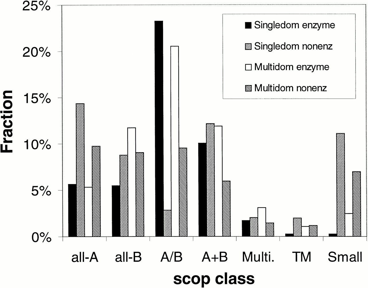 Distribution of proteins amongst broad structural and functional classes; the distribution of the matches among the seven structural and two functional classes in single- and multi-domain proteins. The single-domain and multi-domain matches each total 100%, independently of each other. The horizontal axis indicates the seven scop classes, which are (from 1 to 7): all-alpha, all-beta, alpha/beta, alpha + beta, multi-domain, membrane, and small protein.