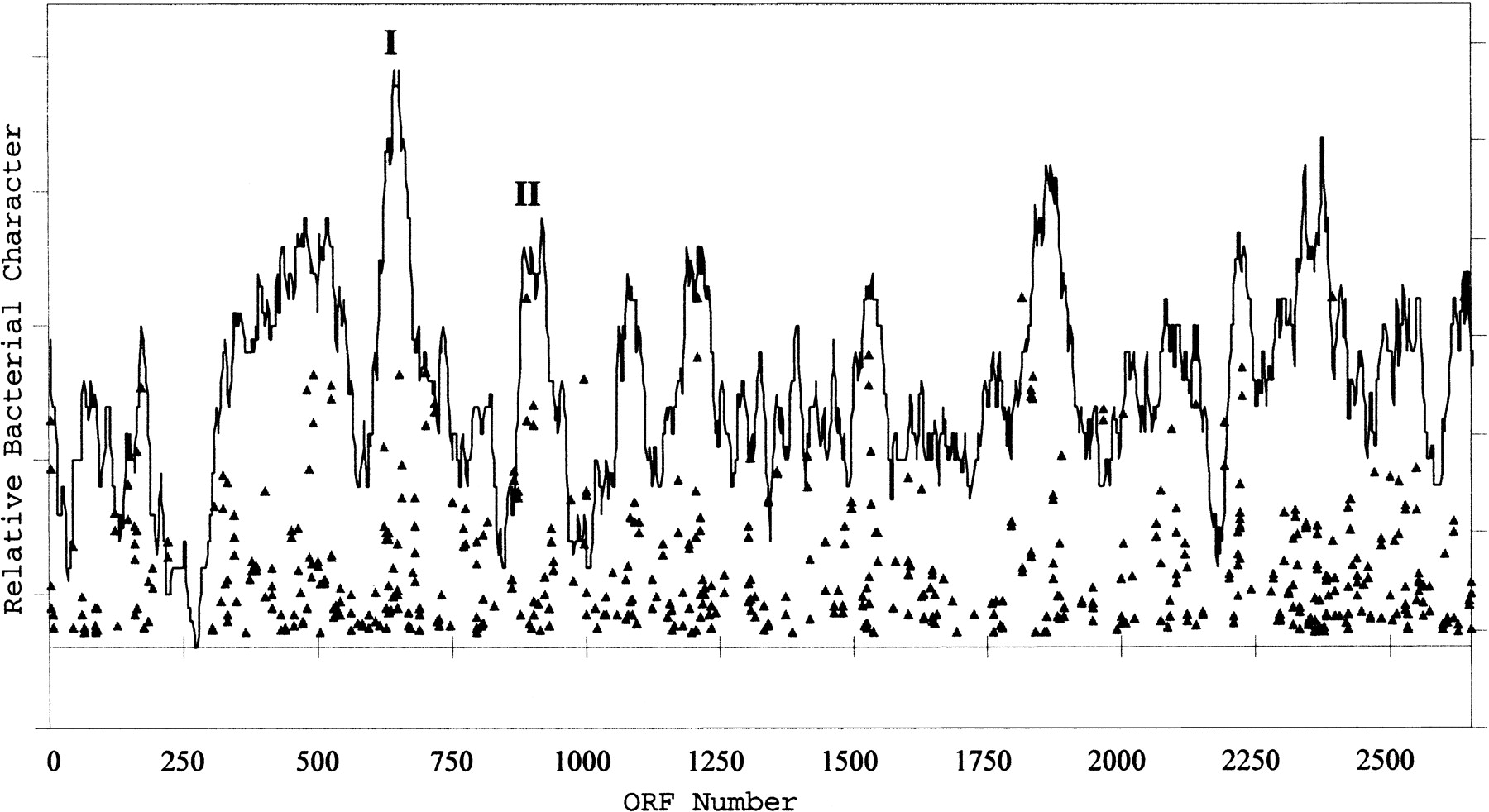 Graphical representation of the relative amount of homology between predicted proteins in the large chromosome of NRC-1 to those encoded byDeinococcus radiodurans and Bacillus subtilis. NRC-1 chromosomal ORFs are plotted on the X axis. Triangles represent NRC-1 ORFs with BLAST P values <e −29, with more significant scores higher on theY axis. Average bacterial character is shown by the percentage of predicted ORFs in a 40-ORF window that showed BLAST P values of <1 × 10−10. The labeled peaks correspond to regions harboring genes encoding NADH dehydrogenase (I) and menaquinone biosynthesis (II), components of the electron transport chain.