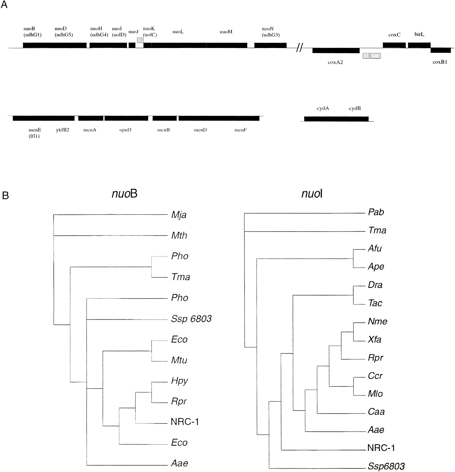 (A) Genetic maps of aerobic respiration genes. The first row contains the nuo and cox genes in the region from 485,000 to 506,000 bp. The second row contains the men andcyd genes in a chromosomal region from 821,000 to 829,000 bp and pNRC100, respectively. The genetic nomenclature for somenuo and men genes was changed from our earlier work (Ng et al. 2000); changes are indicated parenthetically. (B) Phylogenetic trees of nuoB and nuoI gene products. Branches are labeled for each gene with the corresponding three-letter organism designations except for Ssp 6803 (Synechocystis sp.) and NRC-1 (HalobacteriumNRC-1).
