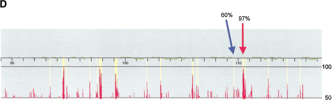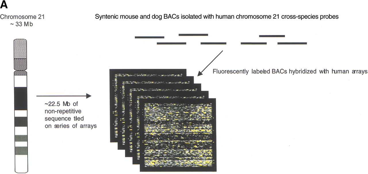 Detection and analysis of evolutionarily conserved sequences on human chromosome 21 by cross-species comparisons using high-density arrays. (A) The chromosome 21 arrays were designed using nonrepetitive sequences and hybridized with syntenic mouse and dog BACs (horizontal lines). A low-magnification view of a fluorescence hybridization image of an array is shown. (B) Chromosome 21 reference sequence was tiled as 25-mer oligonucleotides (probes). Each nucleotide of the reference sequence was interrogated by four probes: one probe complementary to the sequence and three probes noncomplementary at the central position. When the fluorescent intensities (white squares) of the complementary probes are greater than that of the noncomplementary probes, similarities between the tiled human 21q sequences and the hybridized animal DNA exist. (C) (Top) Enlarged view of a 21q array hybridized with syntenic dog BAC DNA. Two 30-nt intervals, one with high conformance between human and dog sequences (97% conformance, red rectangle) and one with low conformance between human and dog sequences (60% conformance, blue rectangle), are shown. (Bottom) For the conserved sequence with high conformance, the 29 conforming nucleotides are indicated in red. For the conserved sequence with low conformance, the 18 conforming nucleotides are indicated in blue. (D) CONSEQ plots showing the conserved sequences (red peaks that are highlighted yellow) detected on the above 21q array relative to their position in the human reference sequence (horizontal axis) and their percent conformances (vertical axis). The high-conformance (97%) conserved sequence has been merged with neighboring conserved sequences to form a 190-nt element. The low-conformance (60%) conserved sequence is an isolated 30-nt element. (Small tan rectangles) Positions of interspersed repeats, which compose ∼33.5% of chromosome 21 sequence and were not tiled on the arrays (Supplemental Table 4, http://www.genome.org); therefore, conformance information is absent.