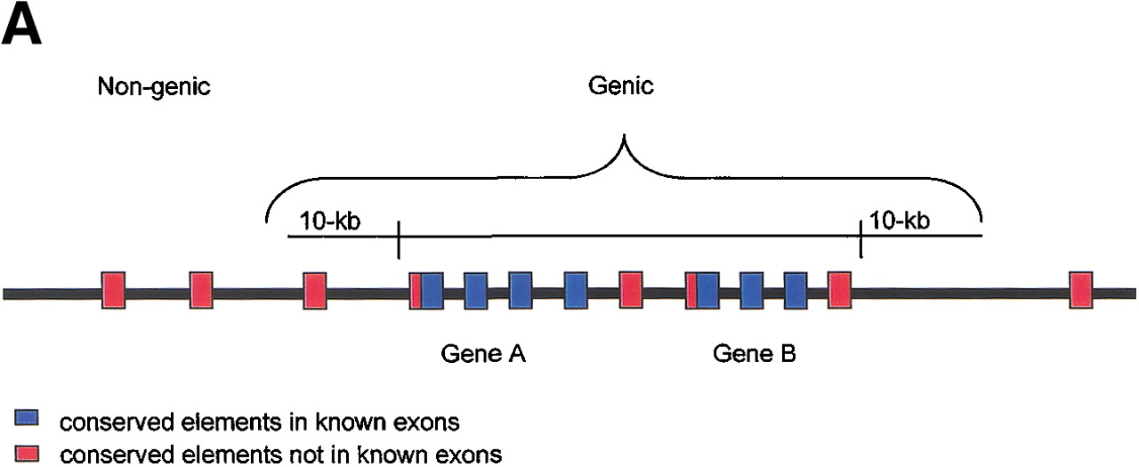 Distribution analysis of conserved human–mouse elements in genic and nongenic intervals on chromosome 21. (A) Diagram illustrating the definition of genic regions as all sequences ± 10 kb of an annotated chromosome 21 gene. (B) The percent of the base pairs identified as conserved in the human–mouse comparison that are located in nongenic and genic intervals.