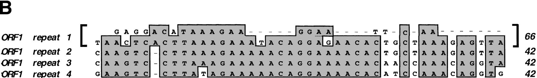 (A) Classification scheme for mouse L1 ORF1 length polymorphism region (LPR) groups, as defined by Mears and Hutchison (2001). LPRs consists of tandem arrays of 66-bp and/or 42-bp blocks, and each begins with a 66-bp block. The 42-bp block is homologous with the 3′ portion of the 66-bp repeat. The novel GF variant has been designated LPR Group V. (B) Alignment of the ORF1 LPR repeats from the GF consensus sequence. As shown in the first line of the alignment, the 5′-most 24 bp of the 66-bp repeat has partial homology with the 42-bp repeat.