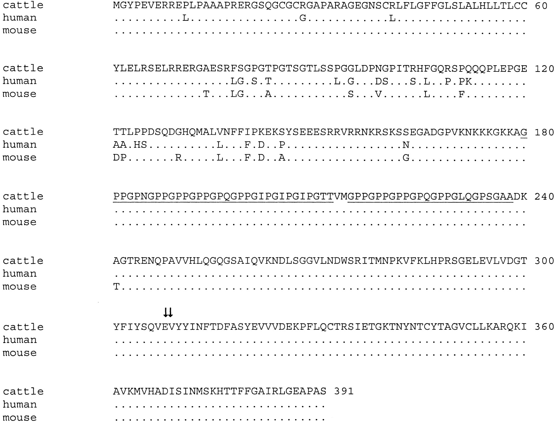 Alignment of the ectodysplasin 1 (ED1-A1) amino acid sequences of cattle, human, and mouse. The interrupted (Gly-X-Y)19 repeat is underlined. Arrows mark the amino acids 308E and309V that are absent from the ED1-A2 isoform. Note the extremely high-sequence conservation of the proteins in the C-terminal region that harbors the TNF-like signaling domain.