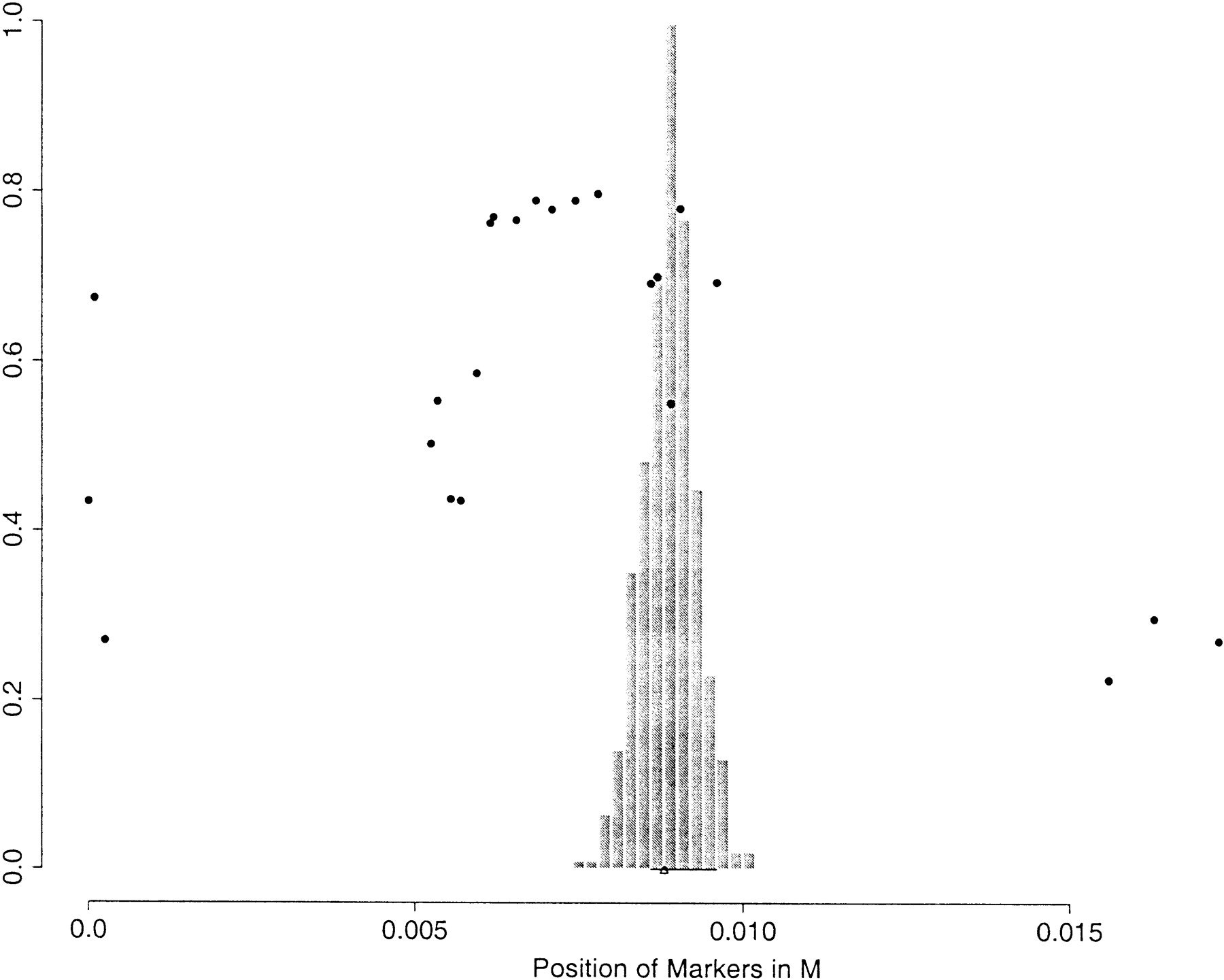 Histogram of a posterior sample for the location of the disease locus for cystic fibrosis. At the bottom of the figure, the true position of the disease-causing mutation is indicated by a small triangle, and the gene that contains it is indicated with a segment. The dots on the graph represent the δ-values for each marker in the dataset.