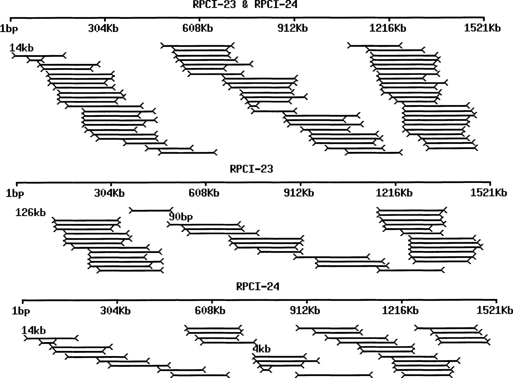 Effective clone coverage and gaps by paired ends of RPCI-23 and RPCI-24. The 1.5-Mb mouse chromosome 17 contig NT_002588‖Mm17_2723 was searched against a database consisting of 119,482 paired ends from RPCI-23 (7.8× clone coverage assuming an average insert size of 197 kb) and 72,433 paired ends from RPCI-24 (3.7× clone coverage assuming an average insert size of 155 kb). The searches were done in two steps as follows: (1) The contig sequence was searched against repeat-masked BESs by BLASTN; (2) the same sequence was researched against a mini-database consisting of unmasked paired ends from the clones identified by step one. Multiple hits were excluded and matches (1) with above, identity ≥ 95%; (2) match length ≥ 3/4 mBES length; (3) paired ends pointing toward each other; and (4) insert size ≤ 400 kb were selected. We have identified a total of 36 RPCI-23 pairs with a clone coverage of 4.6× and an average insert size of 191.6 kb (± 28.5 kb); and 33 RPCI-24 pairs with a clone coverage of 3.4× and an average insert size of 156 kb (± 39.7 kb). The paired-ends matches were plotted with the top for RPCI-23 and RPCI-24 (69 pairs with 7.9× coverage and one 14-kb gap), the middle for RPCI-23, and the bottom for RPCI-24. Bars represent the contig. Lines with arrows at both ends represent the matched pairs. Numbers represent the gaps.