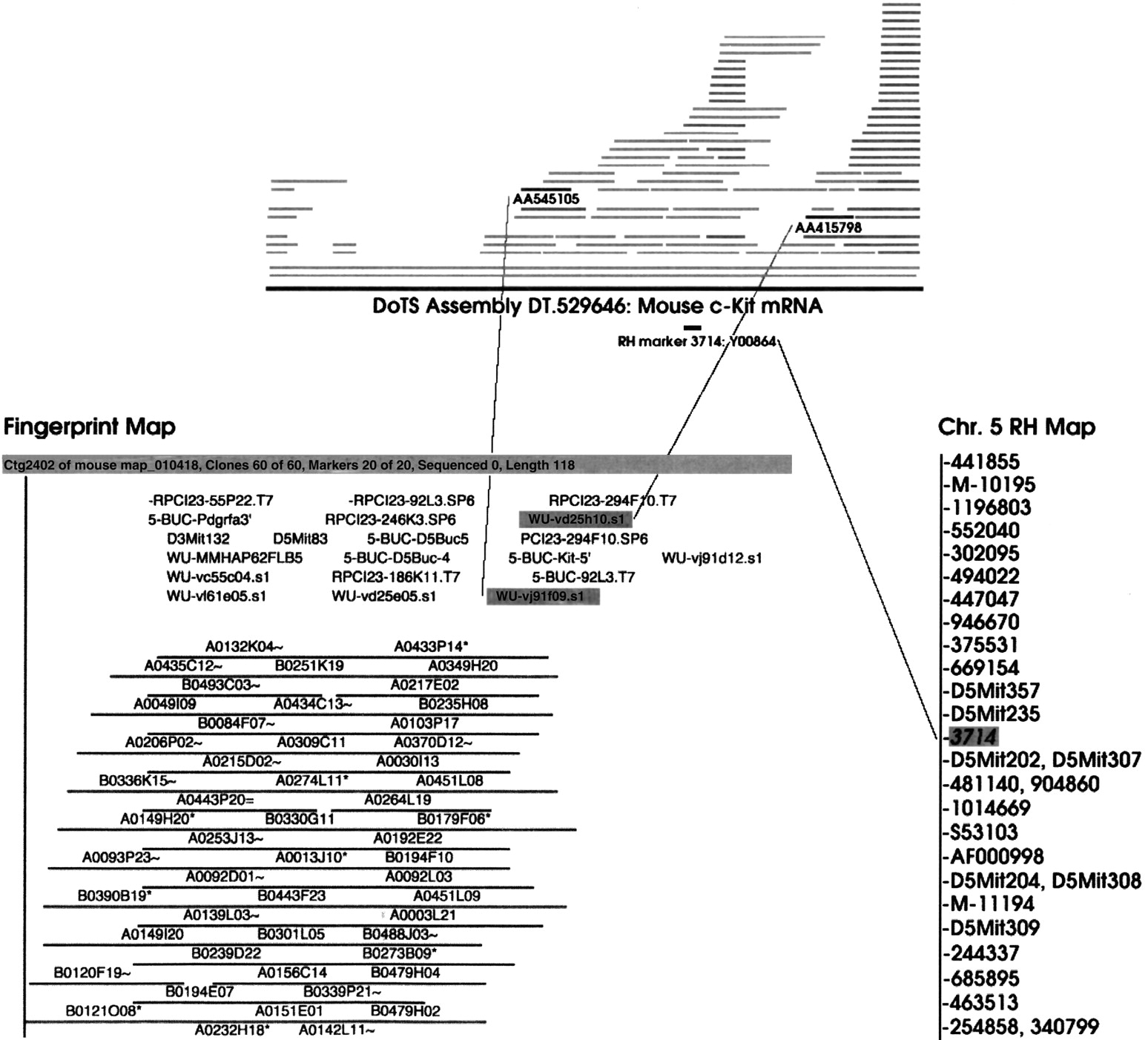 Integration of the RH and BAC fingerprint map through DoTS assemblies. using the DoTS assembly for the Kit gene as an example. This DoTS assembly contains two ESTs that can be linked to the same contig in the fingerprint map (left). E-PCR links the assembly, and hence the fingerprint contig, to the central portion of mouse Chromosome 5 on the MIT/Whitehead radiation hybrid map (right).