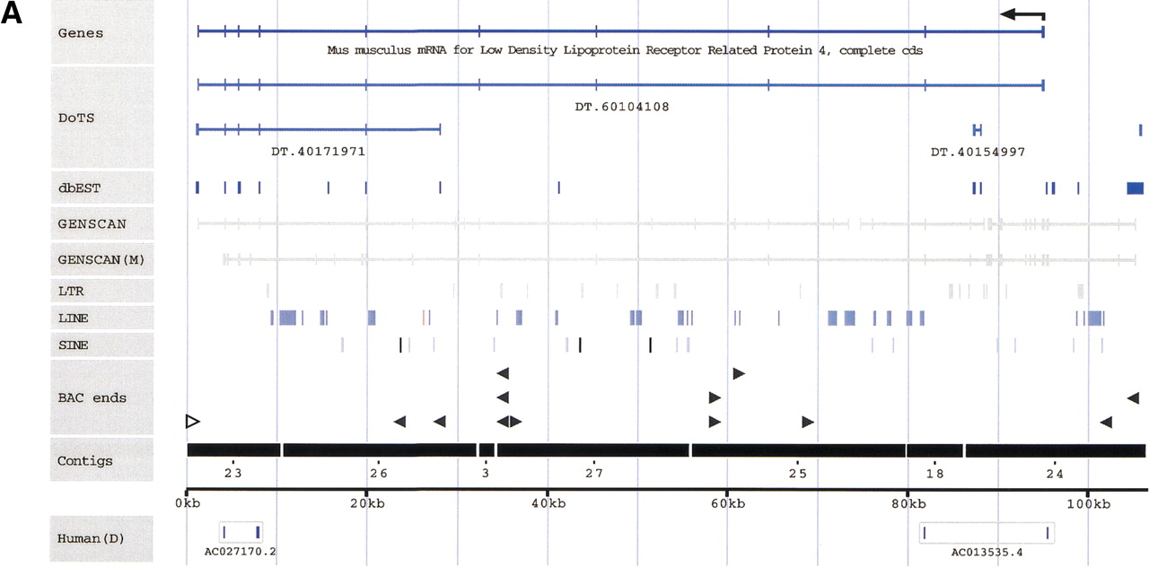(A–C) Sequence annotation of three BAC clones:D5Mit305/Corin (A), Tec–Txk (B), and the Kit upstream region (C). Sequence: The labeled horizontal axis in the middle of each figure indicates the total amount of draft sequence that has been successfully ordered and oriented. Numbers indicate the order and orientation of the individual draft sequence fragments with respect to the original GenBank entry. For example, a fragment labeled “(21)” indicates that draft sequence fragment 21 has been placed in that location in the reverse complement orientation (with respect to the GenBank entry, in which the orientation of the individual fragments is typically arbitrary). Known genes: Shown at the top of each figure, this includes both the annotation of known genes present in GenBank and also the sim4 alignment of any known mRNAs against the mouse genomic sequence. Arrows are used to indicate the start of transcription where appropriate.BLAST-sim4 versus DoTS (EST assemblies). Indicates the (fully-automated) alignment of predicted transcripts from the Database of Transcribed Sequences (see http://www.allgenes.org) with the mouse genomic sequence. Similar transcripts are first identified by aBLASTN search. Those exceeding a user-defined similarity threshold are then sim4-aligned with the genomic sequence. A post-processing step we have implemented eliminates those sim4 alignments that are not “consistent” (with the hypothesis that the transcript represents a “real” gene at that position). The post-processing eliminates numerous low-quality alignments and uses heuristics to identify predicted transcripts that are deemed likely to represent artifacts in the EST databases. EST similarity (dbEST): The results of a BLASTN search against the dbEST database of ESTs. Hits are filtered to show only those alignments that are at least 50 bp long and that show at least 85% identity. GENSCAN: The results of running GENSCAN on both masked and unmasked sequence are shown in gray. Thin lines represent predicted introns and thick lines represent predicted exons. ECRs (Evolutionarily conserved regions): An additional line (Kit only) indicates regions more highly conserved with human finished sequence. These regions were identified with cross_match, using the available finished human sequence for the Kit upstream region (GenBank accession no.AC006552.) Only regions >100 bp and with at least 70% identity are displayed. RepeatMasker: The positions of individual repeat elements are indicated in threeRepeatMasker classes. Repeat elements were identified with the April 4, 1999 version of RepeatMasker using the default parameters (except for the use of “–mus” to indicate rodent sequence). Other features: Indicates any other sequence features of note (Kit only). Human draft sequence: The presence of orthologous human draft sequence on chromosome 4 is indicated below the sequence “axis.” In the interactive version of the display it is possible to click on individual sequences to obtain information on the level of sequence conservation and links to the actual human sequence. The human draft sequence was identified by a BLASTN search of HTG, filtered to show only those meeting the same thresholds as the ECRs (at least 100 bp and no less than 70 % identity.) The GenBank accession numbers of these sequences are shown in the figures. Human sequences labeled as being from chromosome 4 are shown in blue. Those from any other chromosome are red, and those with no chromosomal assignment specified in the GenBank record are gray. TIGR RPCI-23 and RPCI-24 BAC end sequences: We retrieve BAC-end sequences on a daily basis from TIGR, annotating them and entering them into our database. The sequences were searched using BLASTN and those likely to represent true positives are indicated.