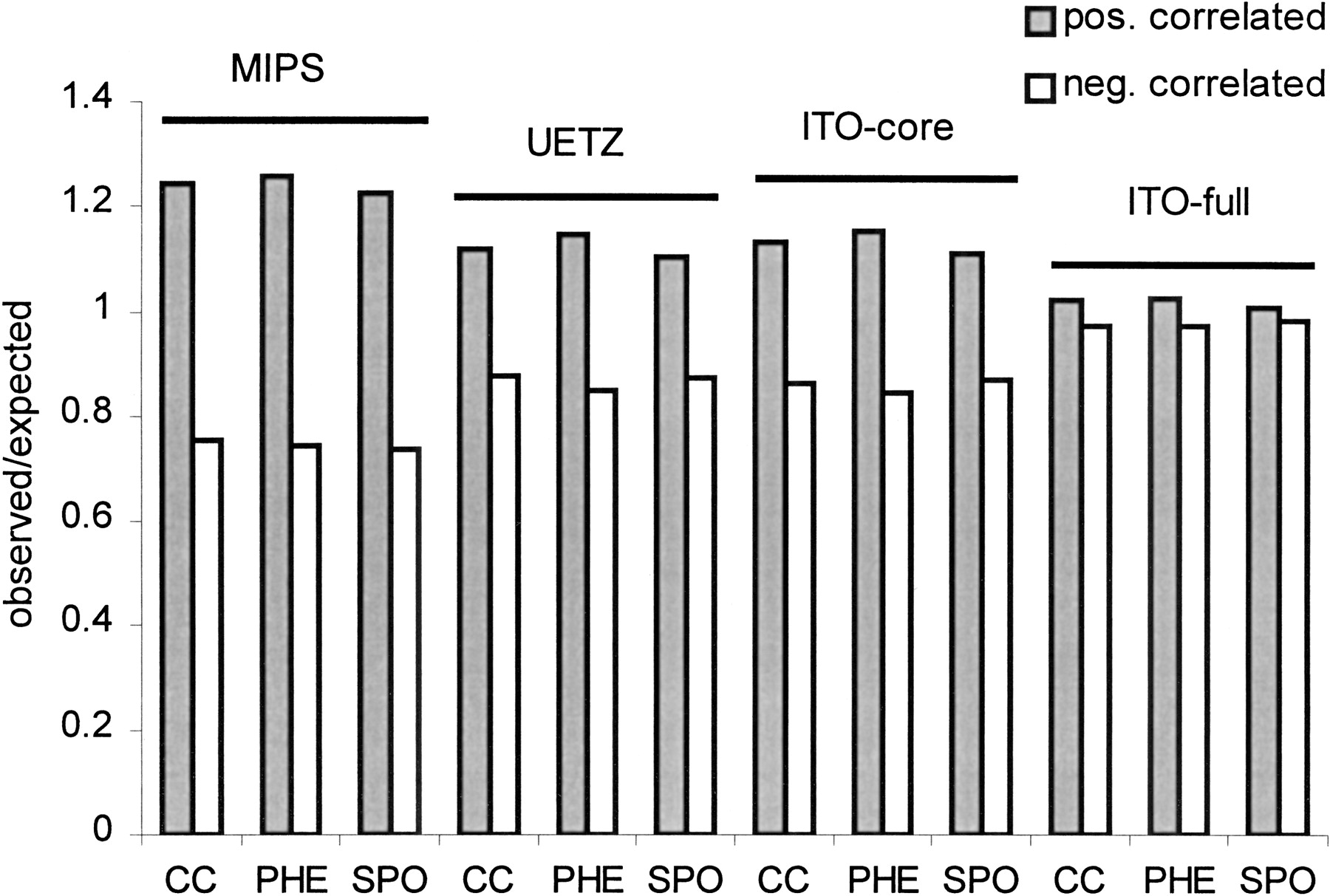 Comparison of distributions of positive and negative correlation coefficients of transcription profiles of interacting protein-protein pairs depicted as ratios of observed number (yeast two-hybrid pairs) and expected number (random pairs) in the genomewide screens (UETZ, ITO-core, ITO-full) and in the pooled single yeast two-hybrid experiments (MIPS). Profiles of interacting proteins from hypothesis-driven experiments show significantly higher positive correlation when compared to the genomewide scans. Transcription data come from three independent genomewide transcription microarray experiments: response to pheromone (PHE), cell cycle (CC), and sporulation (SPO).
