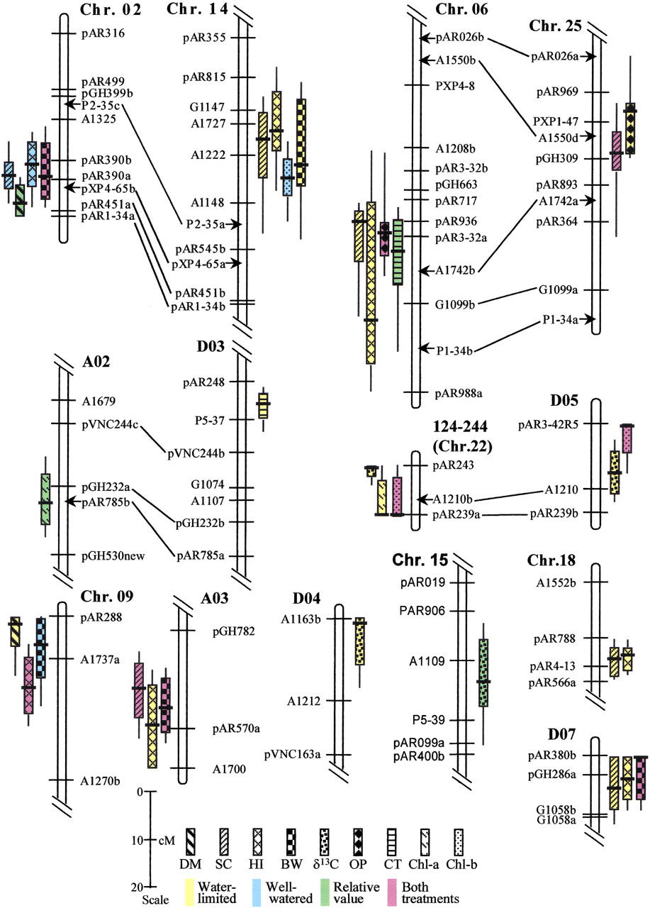 Likelihood intervals for quantitative trait loci (QTLs) implicated in adaptation to arid conditions. The subset of QTLs that were associated with differences between Gossypium hirsutum (GH) andG. barbadense (GB) alleles in productivity (dry matter [DM], seed cotton yield [SC], boll weight [BW], and harvest index [HI]) or physiological traits (carbon isotope ratio [δ13C], osmotic potential [OP], canopy temperature [CT], chlorophyll a content [Chl-a], and chlorophyll b content [Chl-b]) under arid conditions (including relative values) are plotted. In addition, any closely associated QTLs affecting these traits in the well-watered environment or in both treatments are also shown. Traits, environment specificity, and scale in Kosambi centiMorgans are indicated in the legend. Bars and whiskers indicate 1-LOD and 2-LOD QTL likelihood intervals, respectively (Paterson et al. 1988). Nomenclature for chromosomes and linkage groups is as described (Reinisch et al. 1994), except for minor modifications based on new data (J. Rong and A.H. Paterson, unpubl.). Homoeologous chromosome pairs are indicated by lines joining duplicated DNA loci detected by common probes, with the A-subgenome chromosome to the left (except Chr 22–D05, which appears to be an association between two D-subgenome chromosomes; Reinisch et al. 1994). Loci indicated by arrows did not segregate for DNA polymorphisms in this population but are inferred from the primary reference population (Reinisch et al. 1994) to clarify homoeologous alignments. The group designated 124–244 reflects (arbitrary)Mapmaker numbers for the two loci that could be directly mapped in this linkage group – this group is thought to represent Chr 22 based on prior mapping of these loci, but this designation is considered preliminary because it is based on only two loci. To meet space requirements, some chromosomes or linkage groups have been truncated, not showing areas that do not contain relevant QTLs.