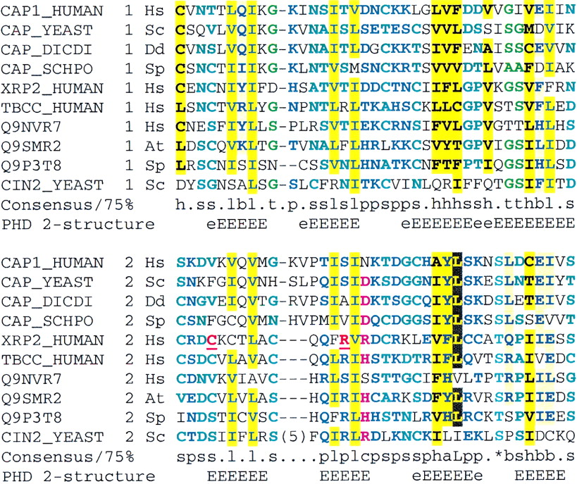 Multiple sequence alignment of tandem duplication of CAP-related protein (CARP) domains in adenylyl cyclase-associated proteins (CAPs) and other proteins presented using CHROMA(Goodstadt and Ponting 2001). The tandem contiguous CARP domain repeats are shown in two successive tiers in the following order (amino acid numbers and GeneInfo codes): Homo sapiens (Hs) CAP1 (356–431: 399184); Saccharomyces cerevisiae (Sc) CAP (Srv2p) (406–481: 134897); Dictyostelium discoideum (Dd) CAP (344–419: 1705592); Schizosaccharomyces pombe (Sp) CAP (432–507: 543928); H. sapiens Xrp2 (67–140: 6831708); H. TCC (211–284; 6831693); H. sapiens FLJ10560 (337–410: 8922517);Arabidopsis thaliana (At) T5J17.90 (206–279: 7487709),Schizosaccharomyces pombe SPAC328.08c (151–223: 8894859); andS. cerevisiae Cin2p (130–208: 1168956). Underlined residues in human RP2 are mutated in individuals with X-linked retinitis pigmentosa (Schwahn et al. 1998; Mears et al. 1999). Secondary structures predicted (Rost and Sander 1993) at expected accuracies of >82% (E) or >72% (e) are indicated below the alignment (E/e, extended or β-strand structure).