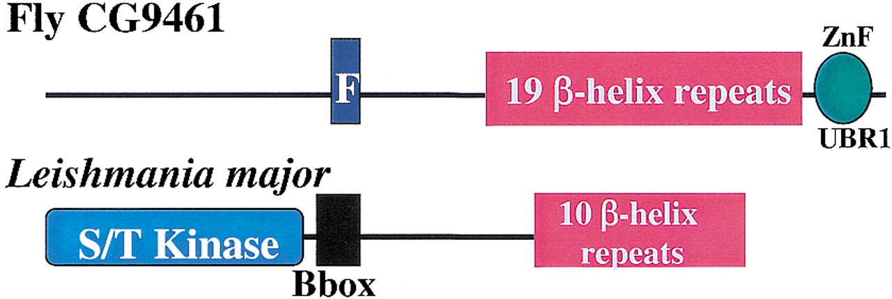Schematic representation, shown approximately to scale, of the domain architectures of some of the proteins containing repeats or domains that are discussed in the text. Abbreviations: AAA, ATPases associated with a variety of cellular activities; AspRS core, the catalytic portion of aspartyl tRNA synthetases; Bbox, B-box type zinc finger; C2, Protein kinase C conserved region 2 (CalB) domain; F, F-box domain; OB, oligonucleotide/oligosaccharide binding fold; PH, pleckstrin homology domain; R, RING finger domain; T, tectonin-like β-propeller repeats; UCH-1, UCH-2, Ubiquitin carboxyl-terminal hydrolases family 2 (two conserved regions); WD, β-propeller repeat with conserved Trp (W) and Asp (D) residues; ZnF_UBP, Ubiquitin carboxy-terminal hydrolase-like zinc finger; ZnF_UBR1, domain that is involved in recognition of N-end rule substrates in yeast Ubr1p. Solid vertical lines represent predicted transmembrane helices. Double forward slash lines indicate that the protein sequence is N-terminally truncated.