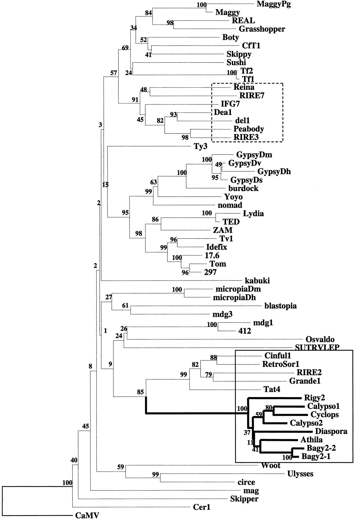 Phylogenetic analysis of the reverse transcriptase (RT) domain sequences of Ty3/gypsy-class retrotransposons. The neighbor-joining tree was inferred from Kimura estimates of sequence distance. Numbers in the branches are the bootstrap values from 500 replicates. Plant elements with env or long 3′ domains are boxed by a solid line and the Athila-clade lines are in bold; gypsy-like plant elements lacking env are boxed by a broken line. A complete list of accession numbers and details for the elements is available at the EMBL European Bioinformatics Institute (EBI) public alignments Web site (http://www3.ebi.ac.uk/Services/align/listali.html) under the accession no. DS44537.