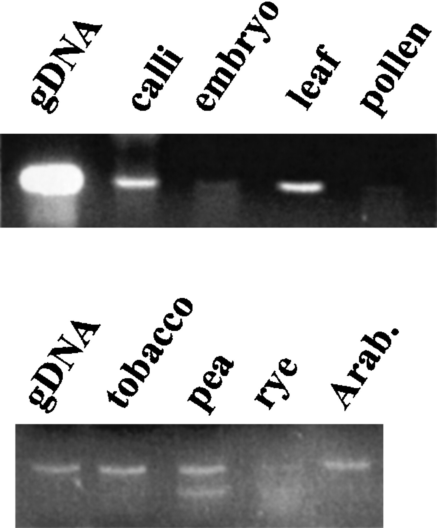 Transcription of env-class retrotransposons. Transcripts were detected by RT–PCR amplification of the rt domain using primers p1 and p2 and produced a product identical to that in Fig. 6. (top panel) Transcription in various barley tissues. Controls consisted of genomic DNA (gDNA in figure) and reverse transcription in the absence of nucleotides (no band produced, not shown). Bands from embryo and pollen are both weak but present. (bottom panel) Transcription in the leaves of other species, the upper band being identical in size to that in barley. Giant radican (Echinodorus muricatus, not shown) also produced a band of identical size.