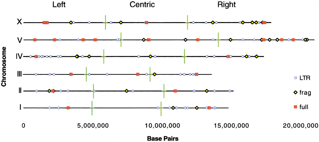 Distribution of Cer full-length, fragmented and solo LTR element sequences in the C. elegans genome. A genomic coordinate value for all Cer elements was calculated (see Methods) and elements plotted to their respective chromosome location. Chromosomes were divided into three regions (left, center, right). All chromosomes except chromosome III display significant clustering outside of the centric genic region. Cer elements are randomly distributed across chromosomes.